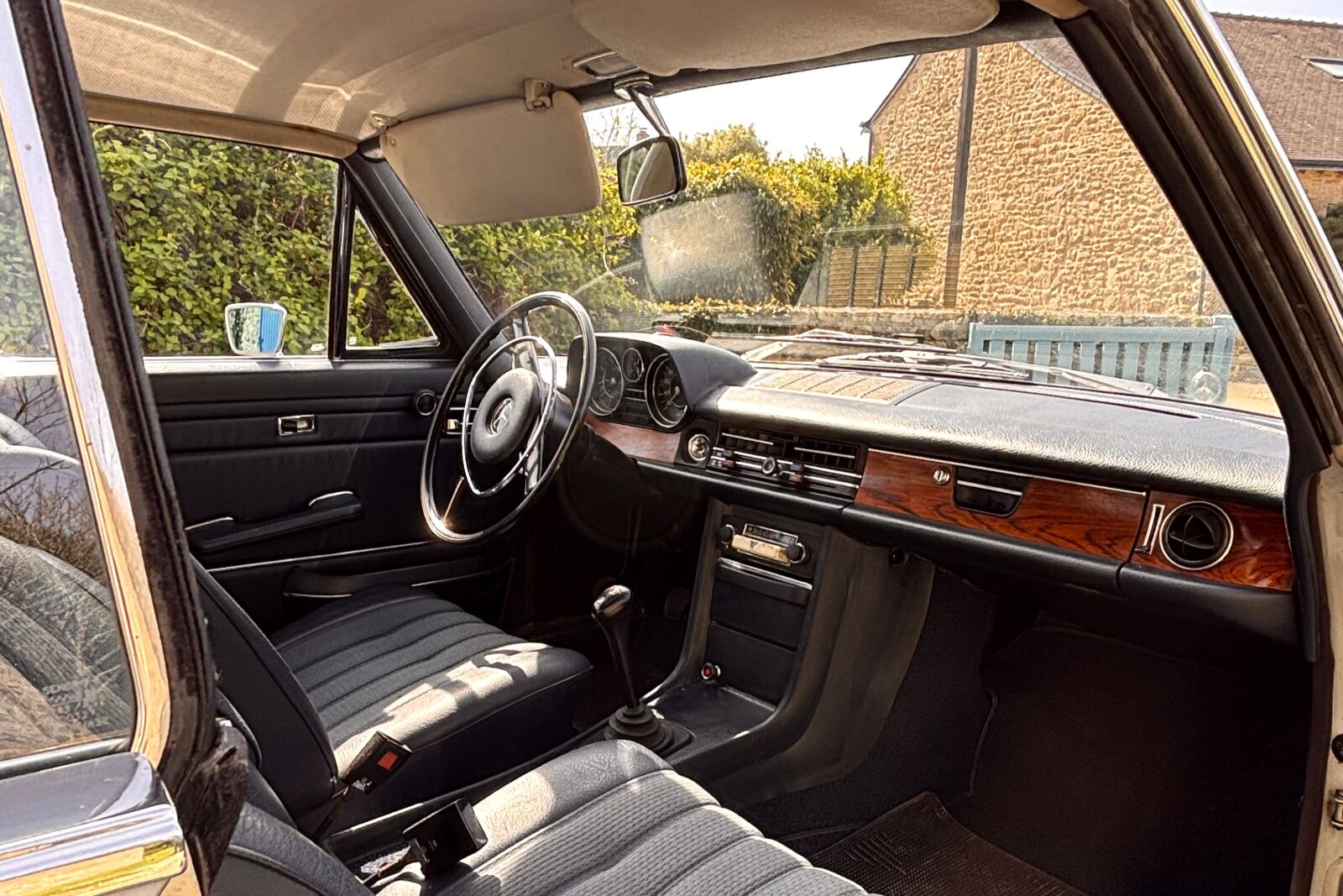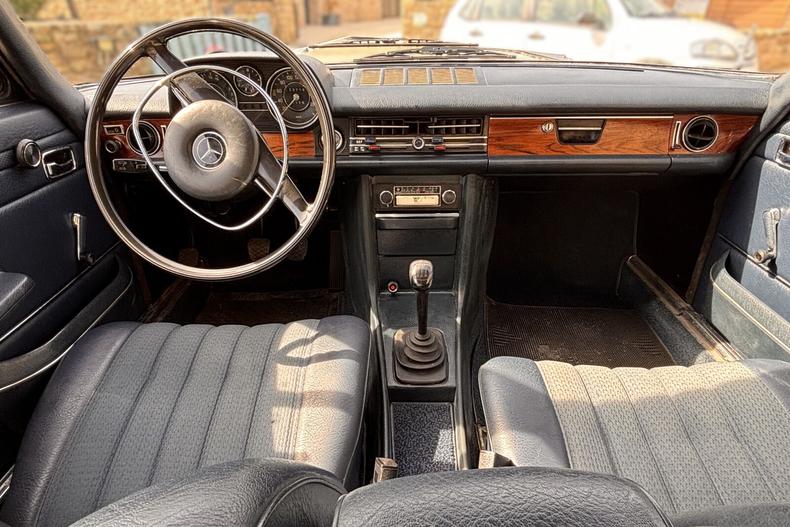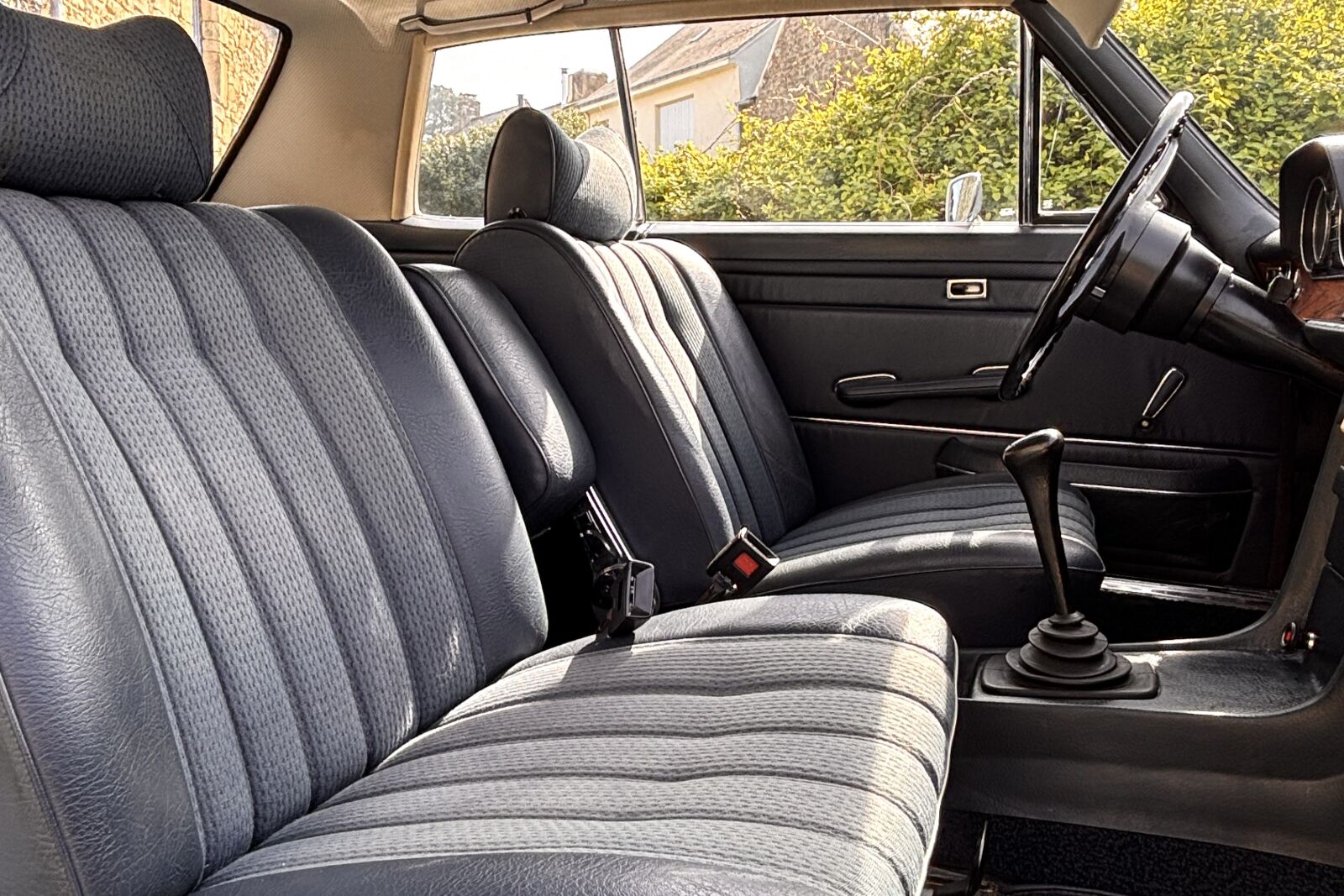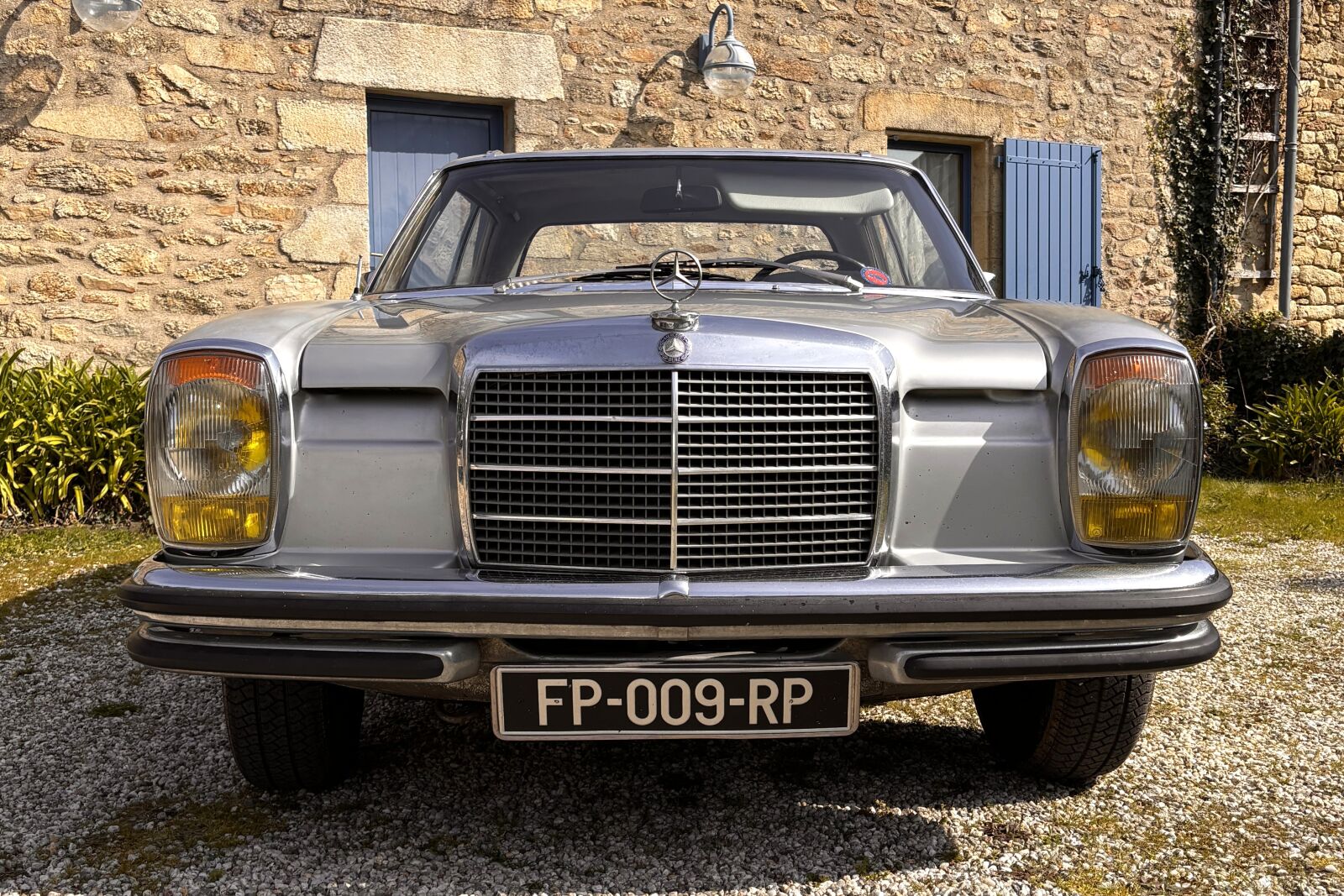 MERCEDES 250 CE type W114 du 13/04/ 1971, Coupé 2 portes 5places, Carte grise française de Collection, contrôle technique favorable Autovision en date du 27/03/2026, n° de série : 11402210015620, 23793 km au compteur, 2° main le propriétaire actuel l'a acquise en 2020 et a depuis effectué les travaux suivants : nettoyage du réservoir, vidanges, remplacement des durits, 4 pneus neufs, ligne complète d'échappement, pompe à essence, jauge, divers silent-blocs, ligne d'injection, 6 injecteurs neufs, biellettes de direction ainsi que le parallélisme. Tableau de bord façon bois bien complet de ses instruments avec autoradio. Moteur 6 cylindres en ligne 2L5 en bon état de marche, 14 CV fiscaux, boite manuelle 5 vitesses. Peinture d'origine gris métallisé. Sellerie velours et simili bleu 2 tons en très bon état de conservation.