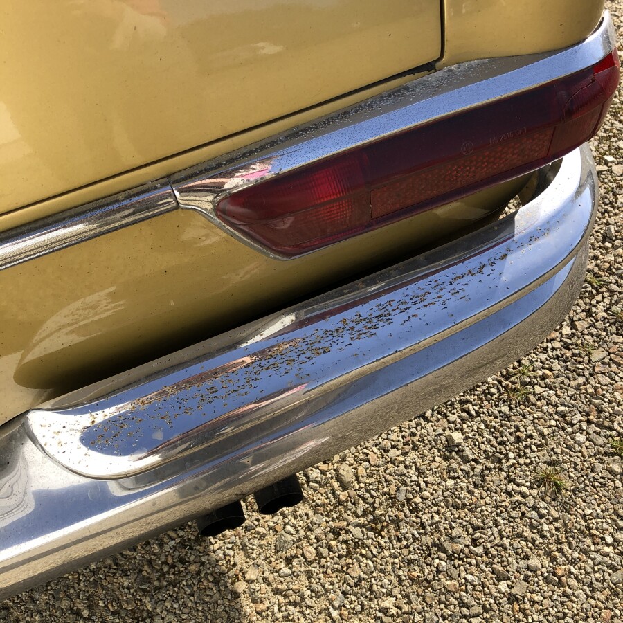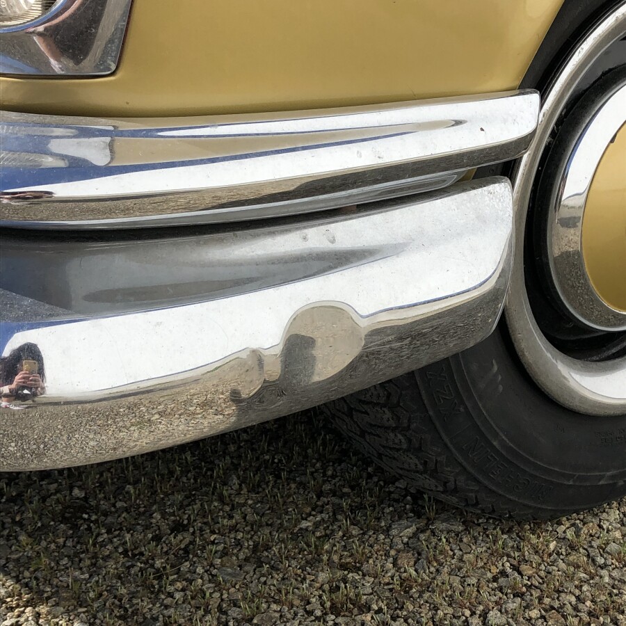 Bon état général. Petites traces de corrosion sur les chromes. Léger enfoncement du pare-chocs à l'avant.
