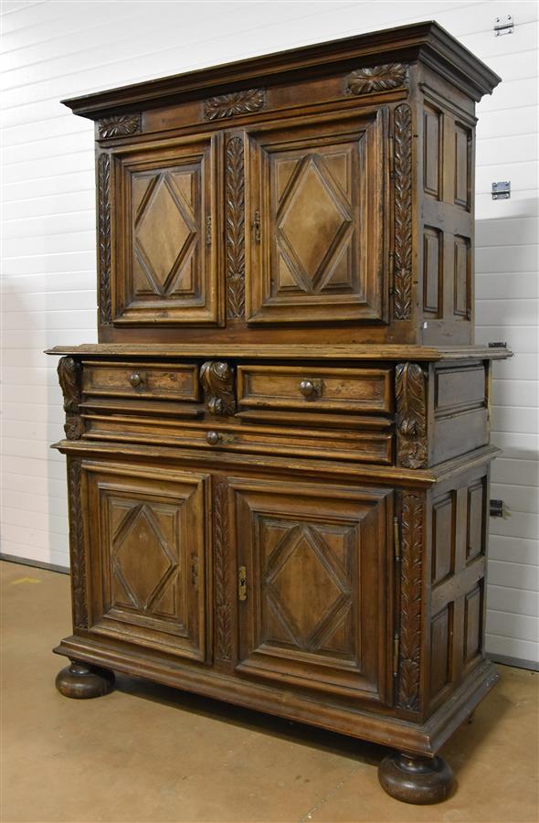 Meuble à deux corps en chêne, il ouvre à 2 vantaux en partie basse, 2 tiroirs en ceinture et 2 vantaux en partie haute, façade moulurée et sculptée de motifs en pointe de diamant et frises de feuilles d'acanthe, début 19e siècle, 144.5 x 62 x H. 209.5 cm (restaurations d'usage).