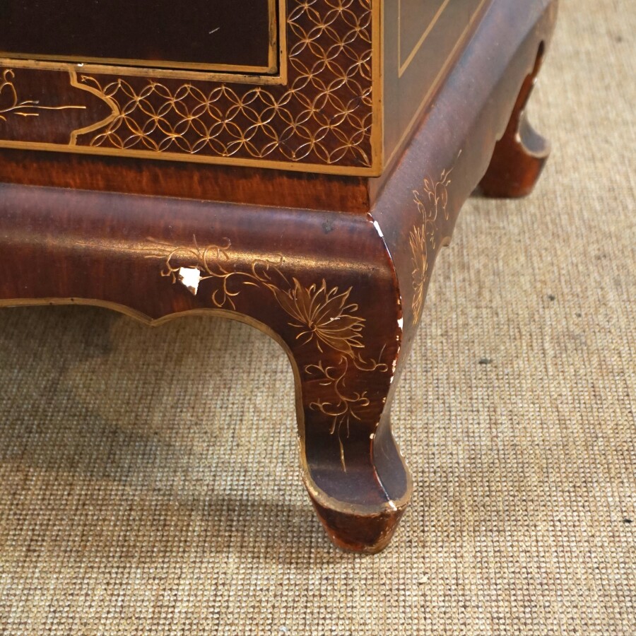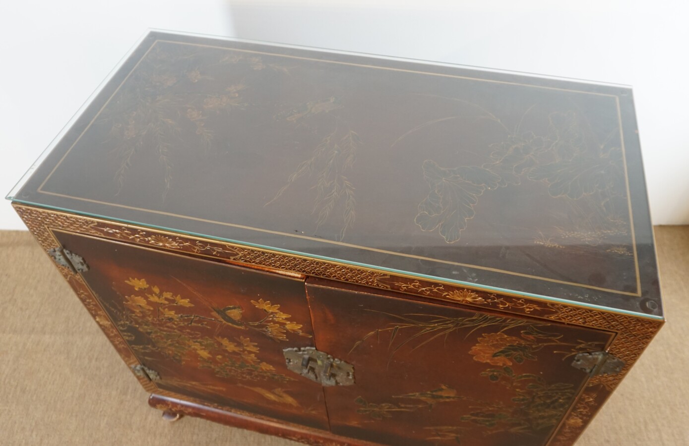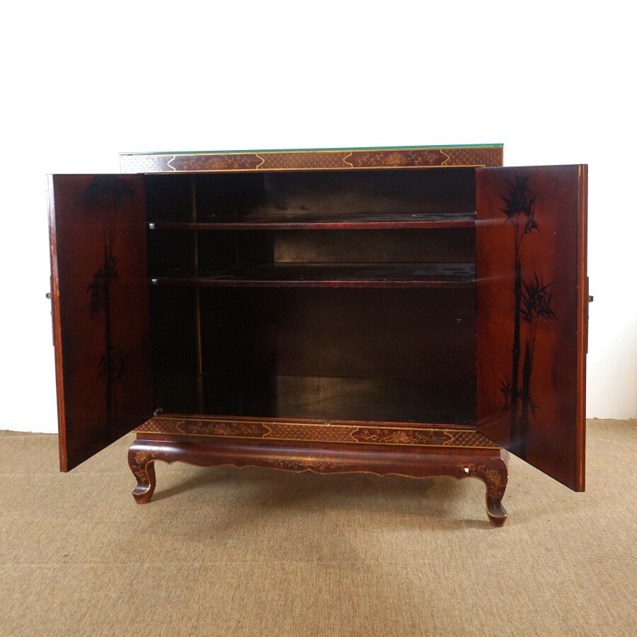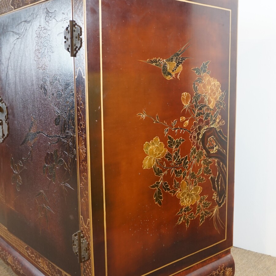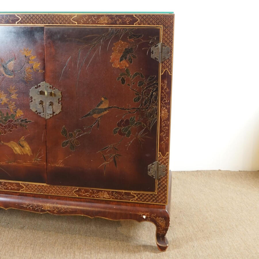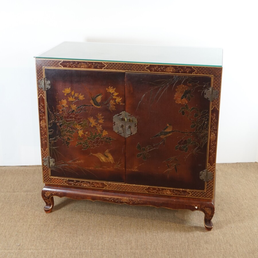 Meuble à hauteur d'appui, bois laqué, ouvrant en façade à deux vantaux découvrant deux étagères, à décor d'oiseaux branchés parmi des feuillages, travail décoratif moderne de style Extrême-Orient, H. 96 x 100 x 50 cm (quelques petits sauts, quelques rayures et usures).