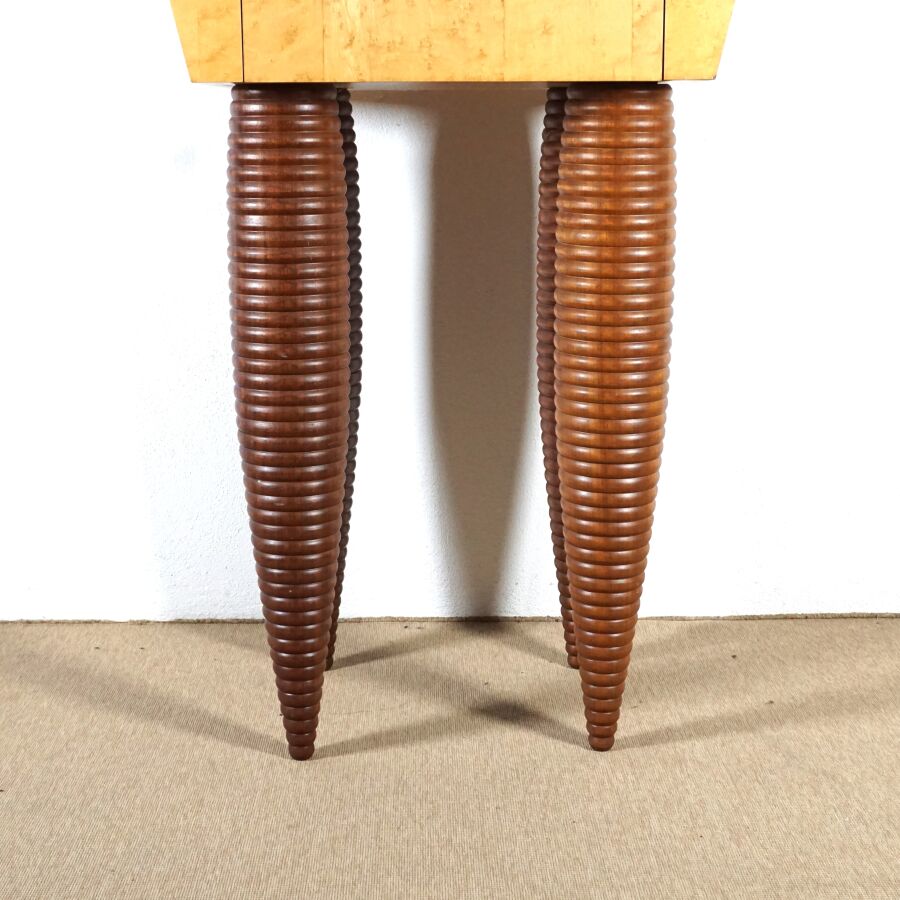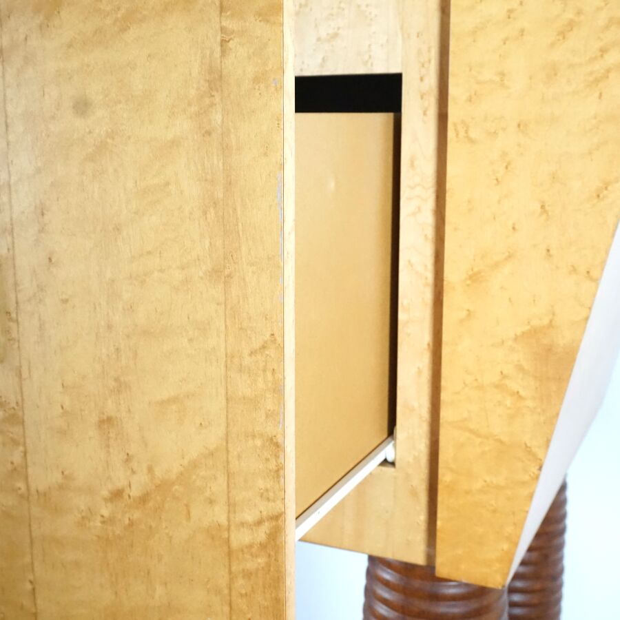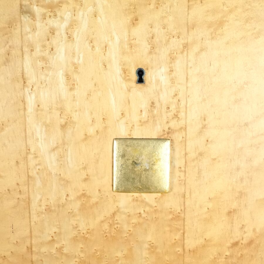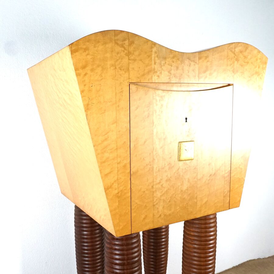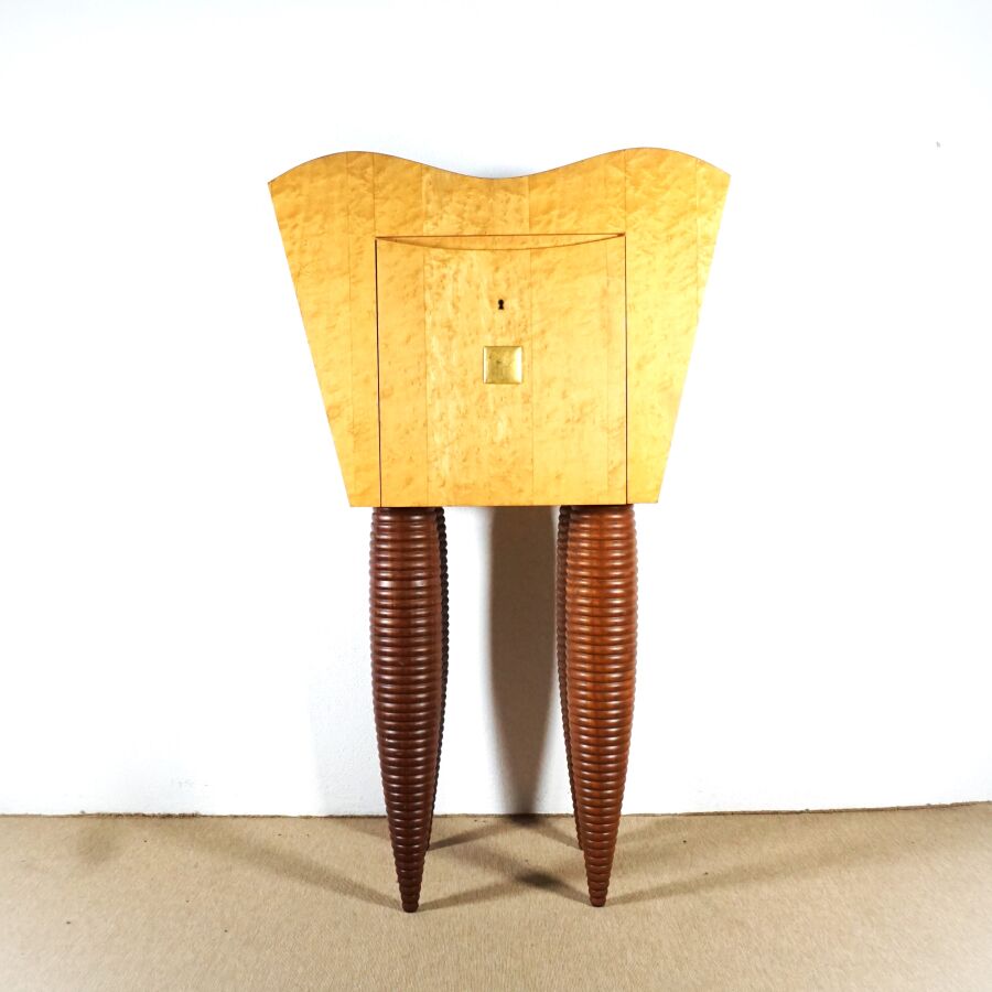 Meuble de rangement de forme organique en bois teinté ouvrant en partie haute à un tiroir orné d'une plaque quadrangulaire dorée, reposant sur quatre pieds tournés, travail moderne, 161 x 92.2 x 62 cm (avec sa clé, quelques usures, griffures).