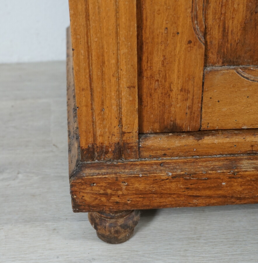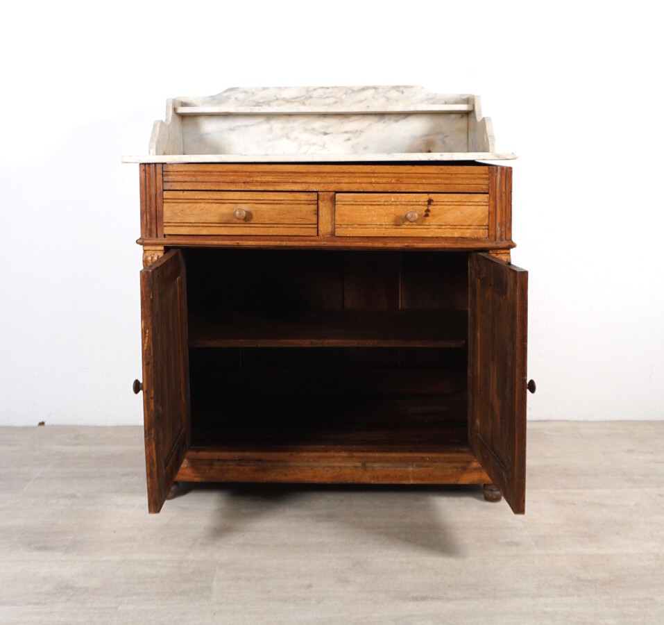 Meuble de toilette en bois naturel, ouvrant à deux vantaux et deux tiroirs, coiffé d'un plateau et gradin en marbre, 20ème, H. 102 x 50 x 90 cm.