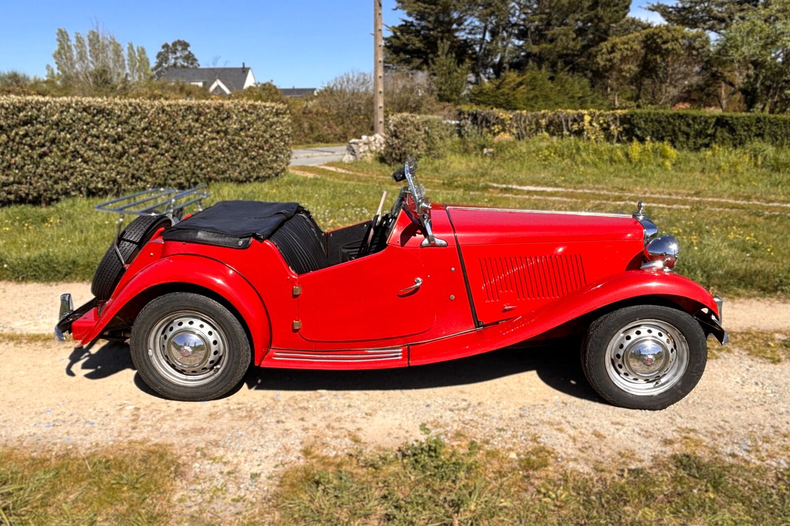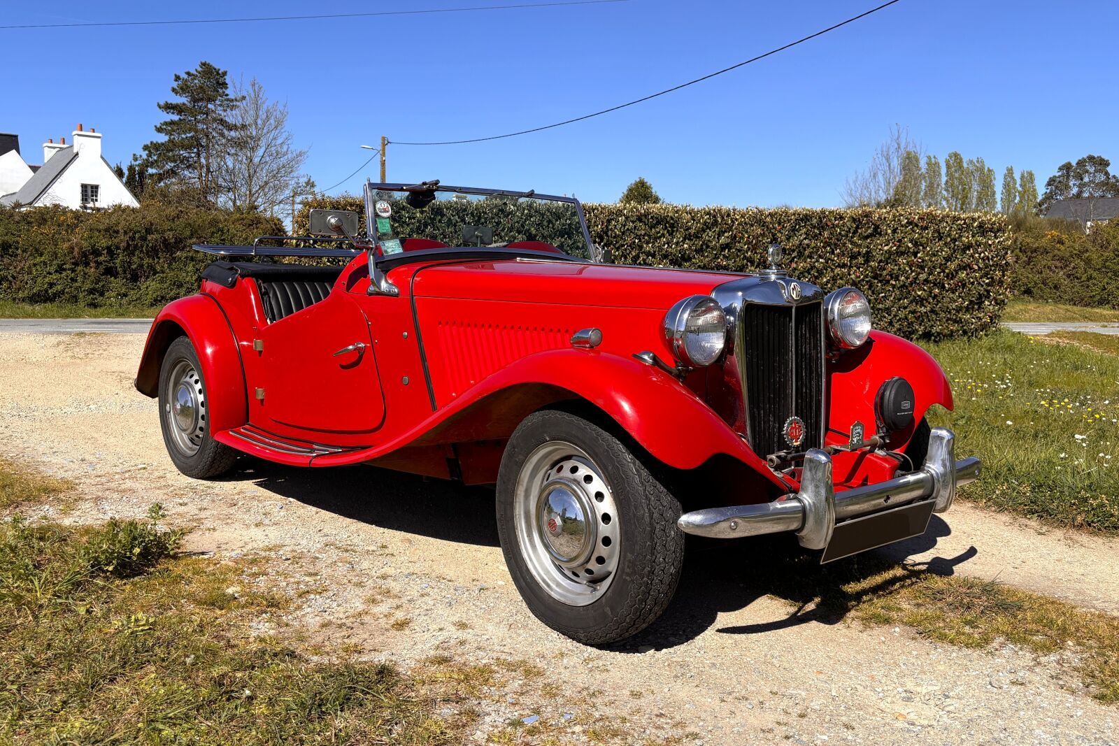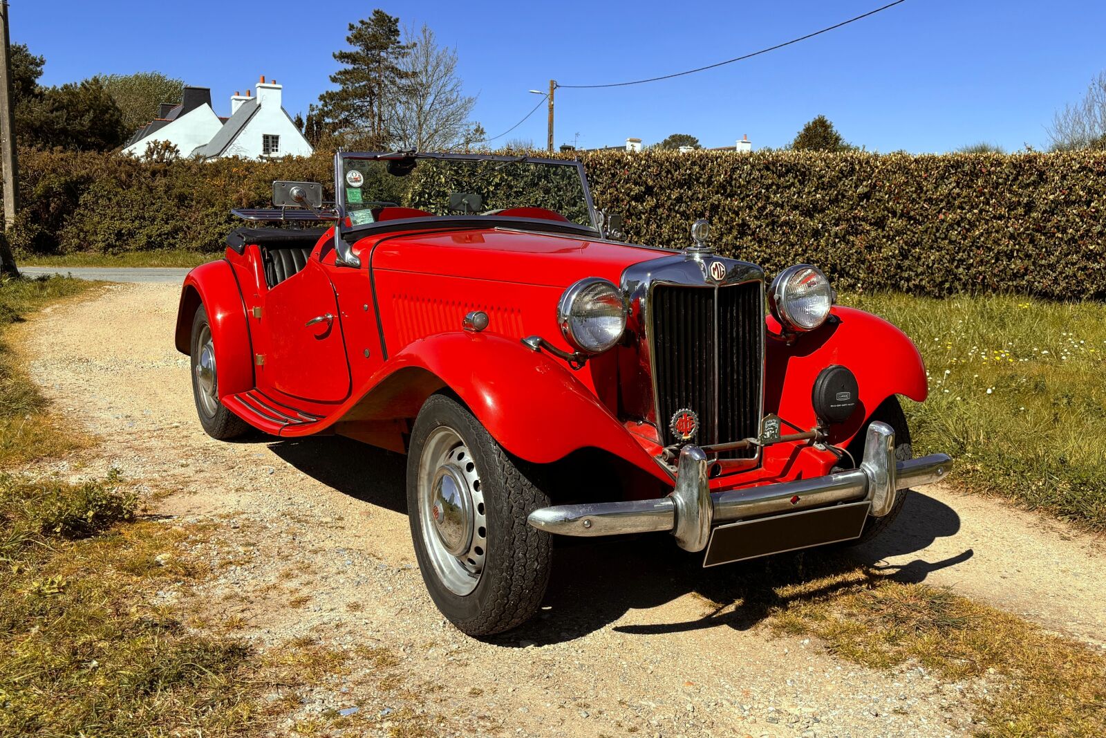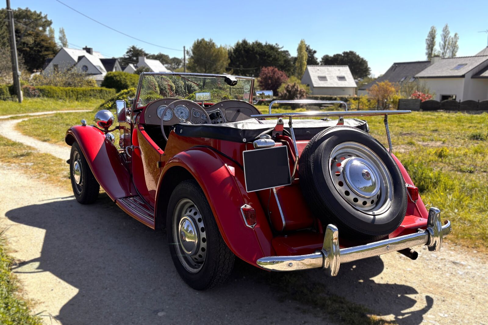 MG TD type MGTDXPEG du 01/01/1951, Cabriolet 2 portes, 2 places, carte grise française de collection avec anciens contrôle tech. et dossier de factures n° de série : 20865 miles au compteur. Carrosserie très saine en parfait état, pare-chocs chromés, peinture de couleur rouge, phares chromés et feux en bon état. Sellerie simili noir. Tableau de bord bien complet, volant à 3 branches d'origine ? Capote de toile noire avec couvre tonneau. Moteur 4 cylindres en ligne 1250 cm3 alimenté par 2 carburateurs SU, 8 CV, boite 4 vitesses manuelle, pneus bon état sur jantes acier avec enjoliveurs chromés. Roue de secours en place à l'arrière avec porte bagages.