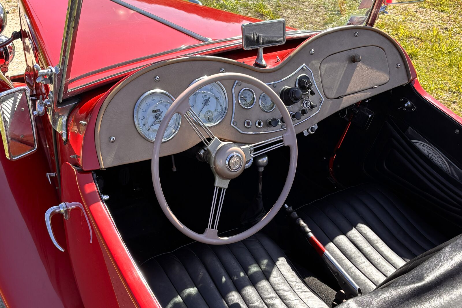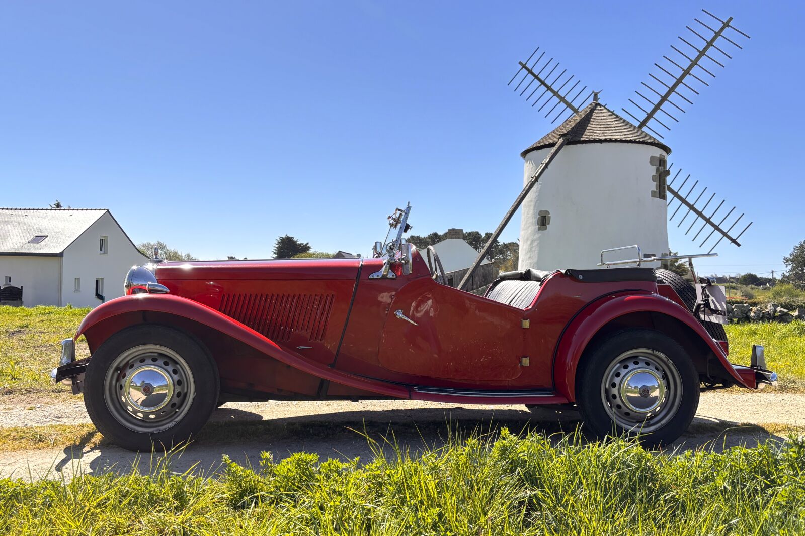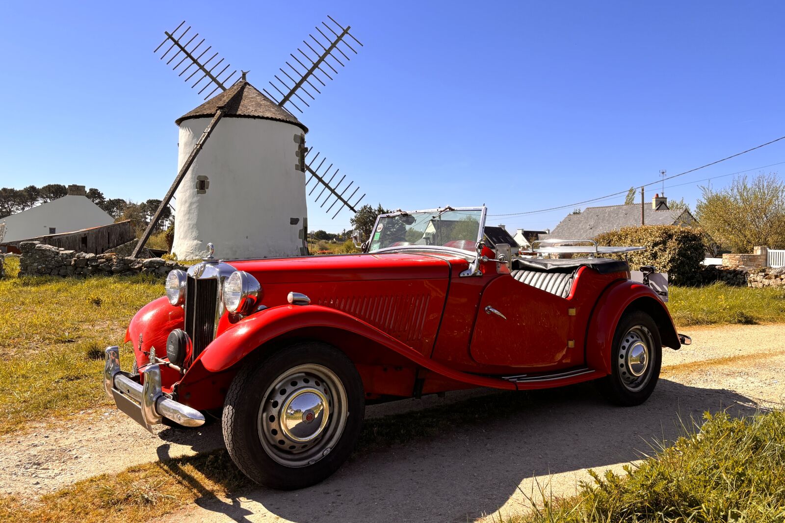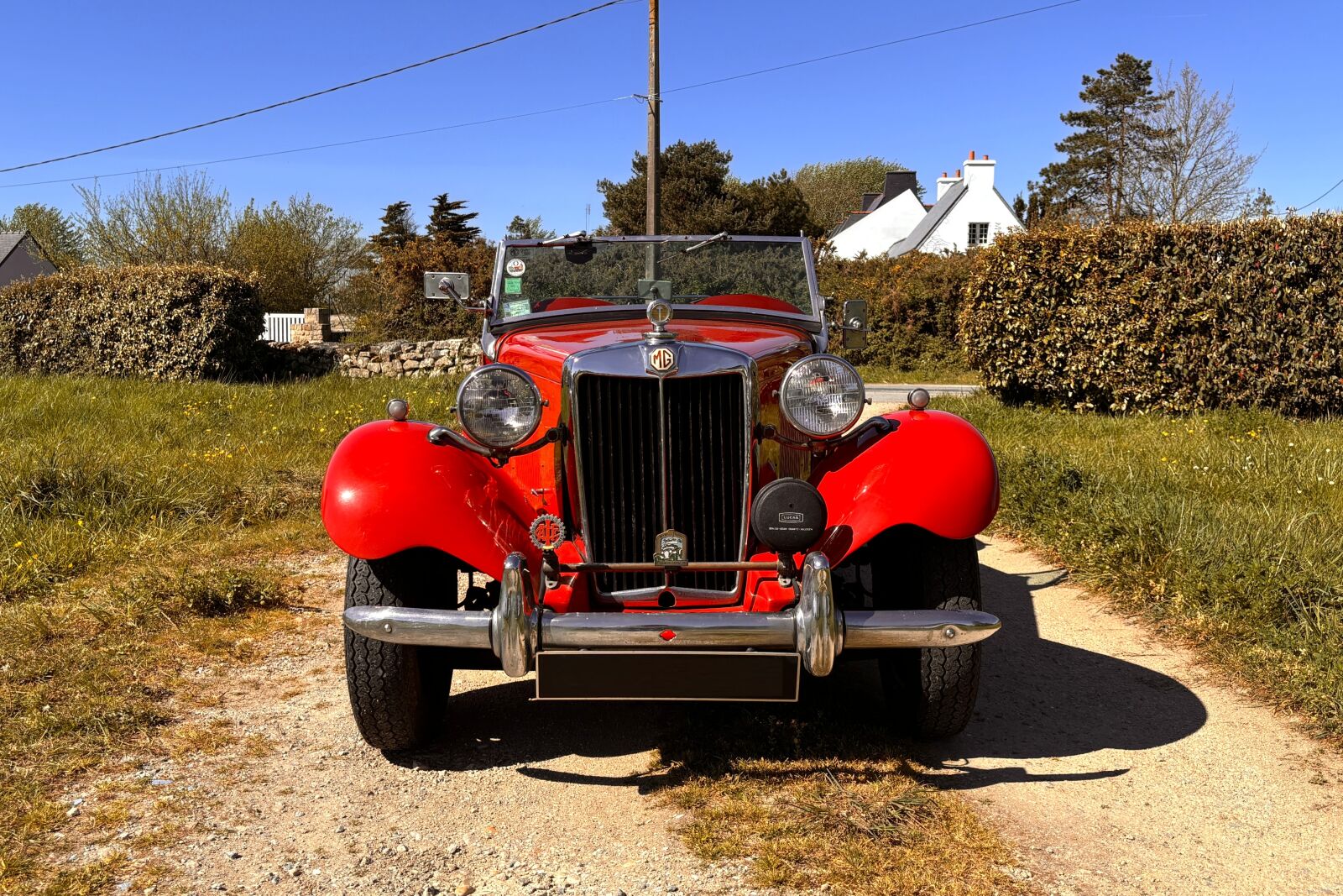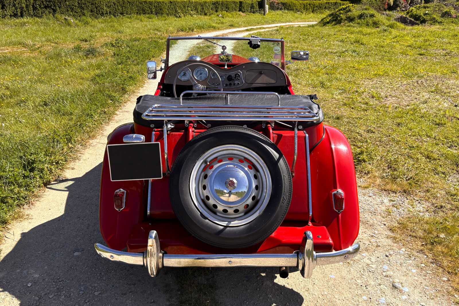 MG TD type MGTDXPEG du 01/01/1951, Cabriolet 2 portes, 2 places, carte grise française de collection avec anciens contrôle tech. et dossier de factures n° de série : 20865 miles au compteur. Carrosserie très saine en parfait état, pare-chocs chromés, peinture de couleur rouge, phares chromés et feux en bon état. Sellerie simili noir. Tableau de bord bien complet, volant à 3 branches d'origine ? Capote de toile noire avec couvre tonneau. Moteur 4 cylindres en ligne 1250 cm3 alimenté par 2 carburateurs SU, 8 CV, boite 4 vitesses manuelle, pneus bon état sur jantes acier avec enjoliveurs chromés. Roue de secours en place à l'arrière avec porte bagages.