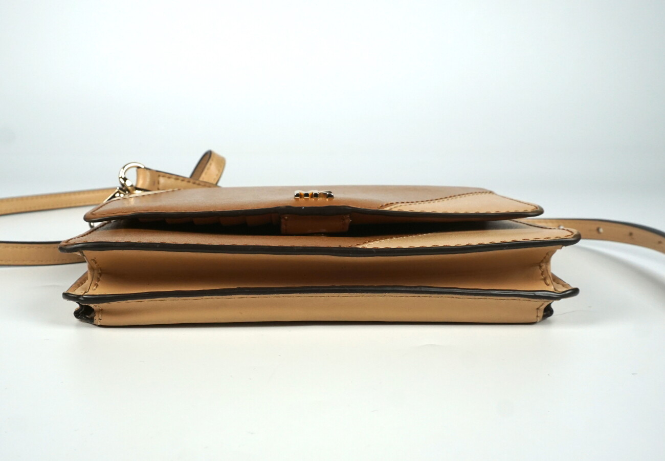 Michael KORS : Petit sac bandoulière en cuir havane, beige et ivoire, formant portefeuille, bandoulière ajustable, 18 x 11.5 cm (petites usures).