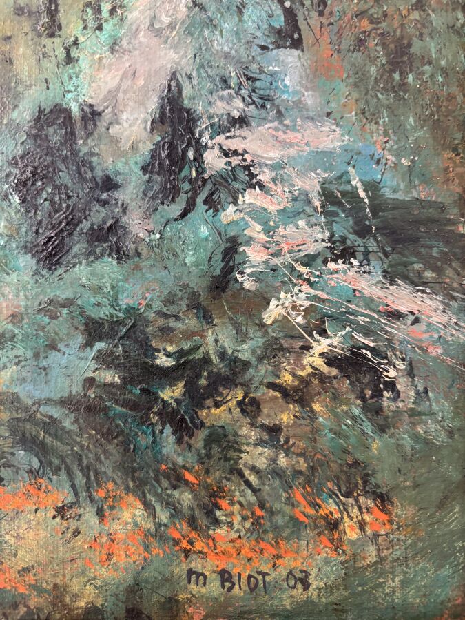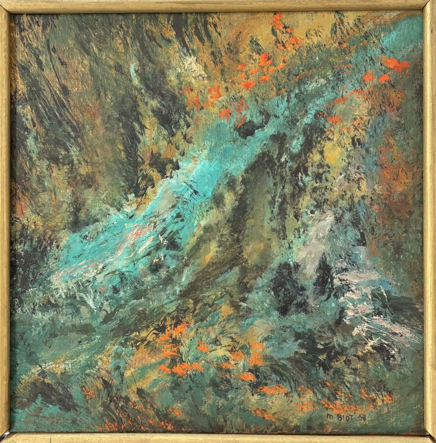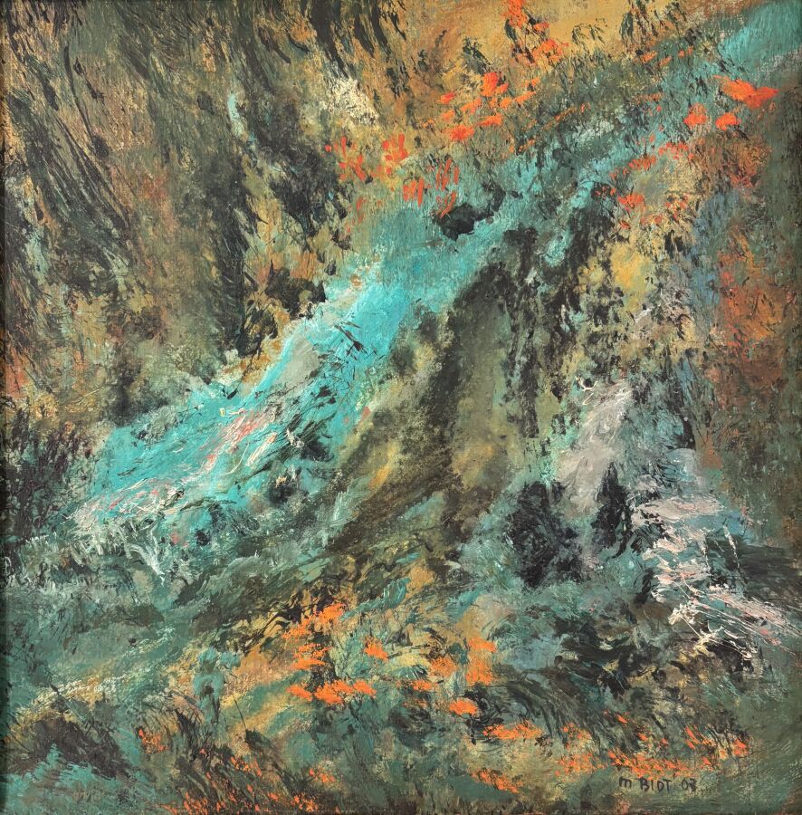 Michel BIOT (1936-2020), "Composition" 63, huile sur toile signée en bas à droite, 40.5 x 40.5 cm.