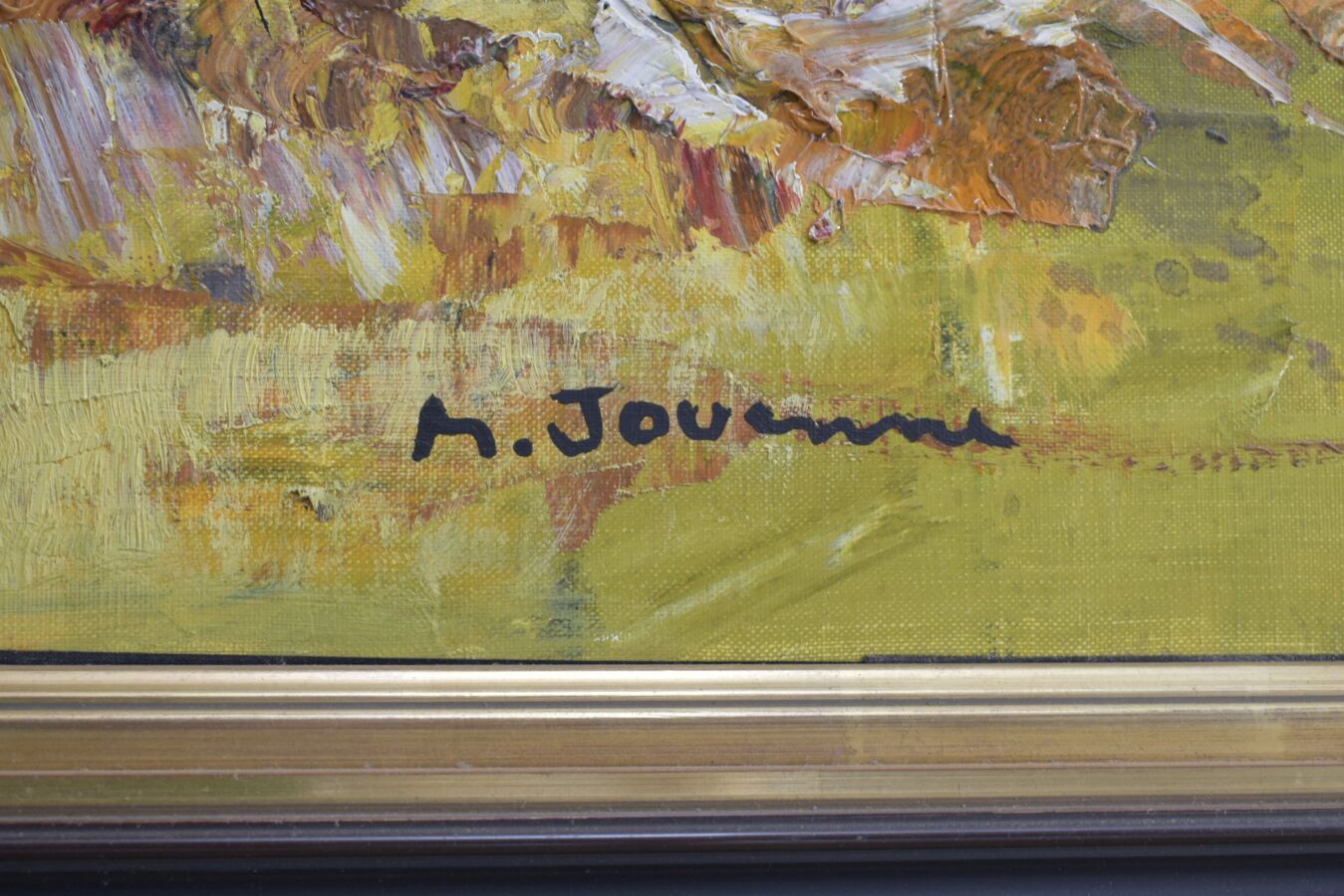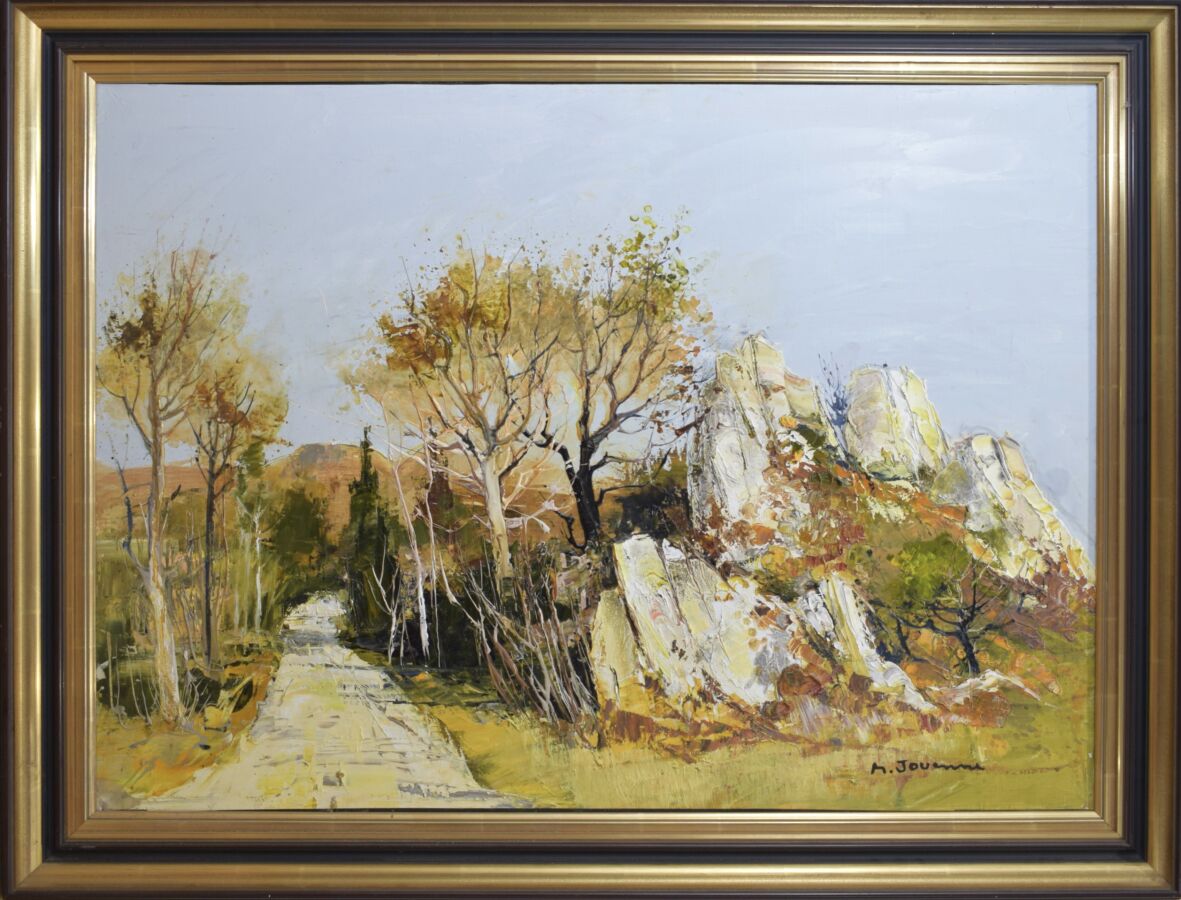 Michel JOUENNE (1933 - 2021), "Les roches blanches", huile sur toile signée en bas à droite, contresignée à l'ancre de marine et titrée au dos, 73 x 100 cm.