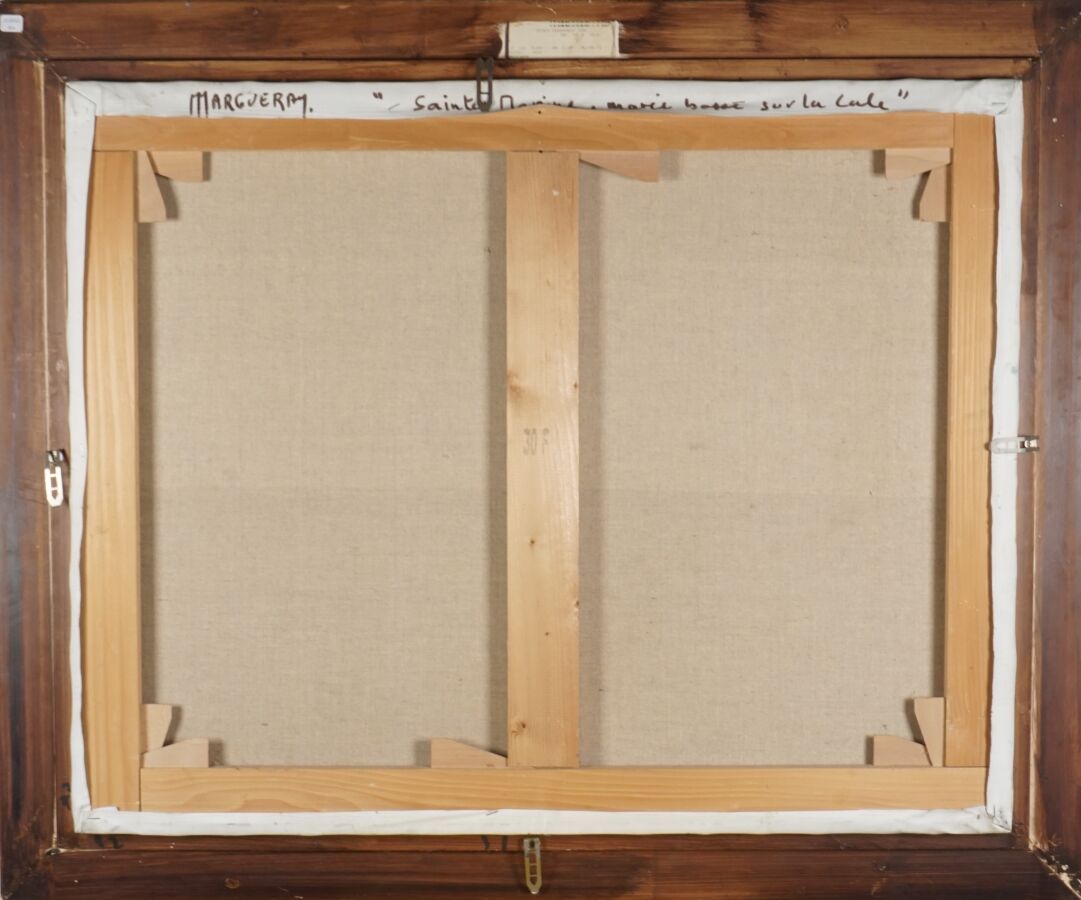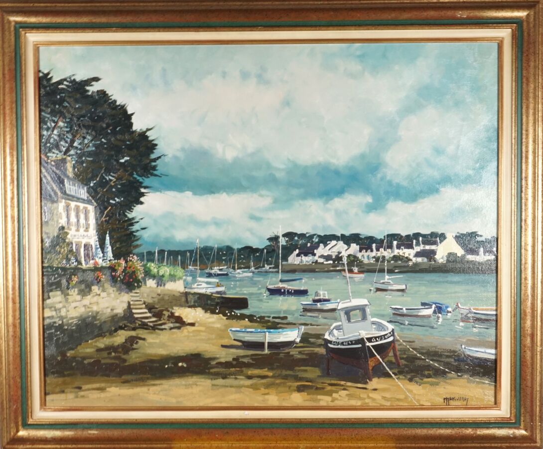 Michel MARGUERAY (1938-), "Sainte-Marine, marée basse sur la cale", huile sur toile signée en bas à droite, contresignée et située au dos, 73 x 92 cm.