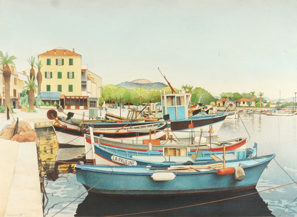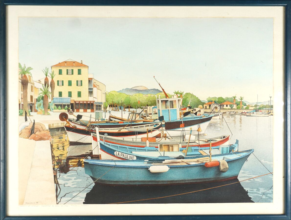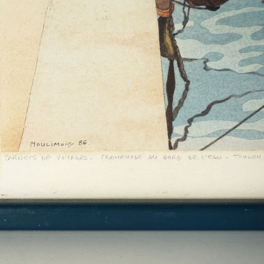 Michel MOULINOIS (XXe), "Sanary, carnet de voyage", pochoir, signé et daté dans la page en bas à gauche, situé dans la marge au crayon, 45 x 65 cm.