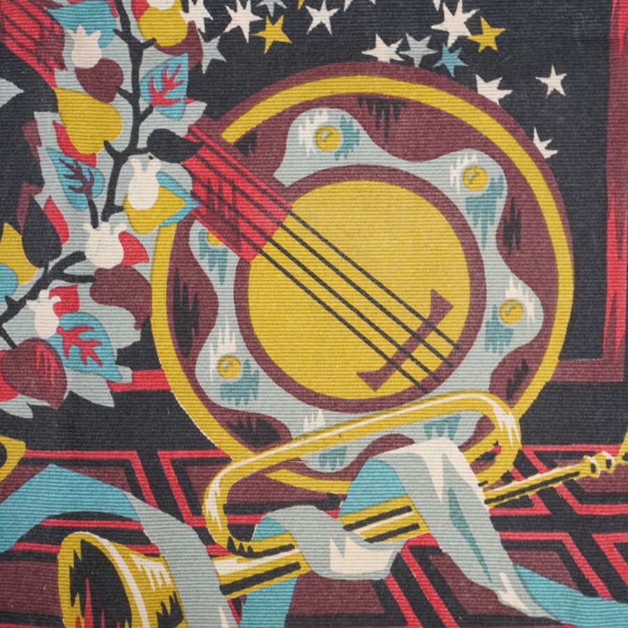 Michèle VAN HOUT LE BEAU (XX-XXIe), "Nature morte à la mandoline", tapisserie, laine polychrome, signée en bas à droite, Manufacture d'Aubusson, 107 x 160 cm (petites usures légères).