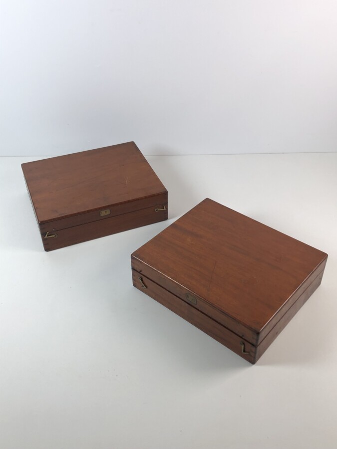 Microscope binoculaire en métal doré, signé R & J BECK, complet de ses accessoires, présentés dans des coffrets en acajou, travail anglais, H. 42 cm.