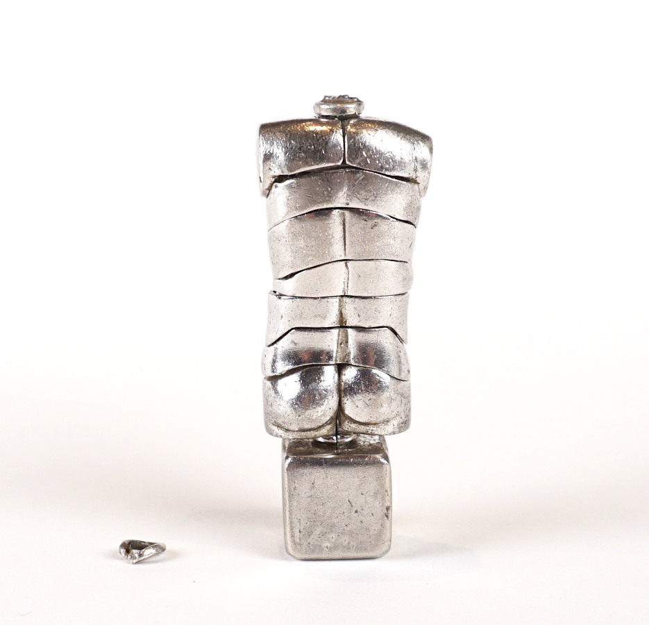 Miguel Ortiz BERROCAL (1933-2006) : Pendentif "Micro David" en argent (925/oo), légèrement articulé, démontable, présentant à l'intérieur un cabochon de lapis-lazuli et un anneau souple relié au sexe en or jaune 18K (750/oo), trace de signature sur le bras gauche, circa 1960, H. 5.7 cm (bélière à refixer). Poids brut : 74.7 g environ.