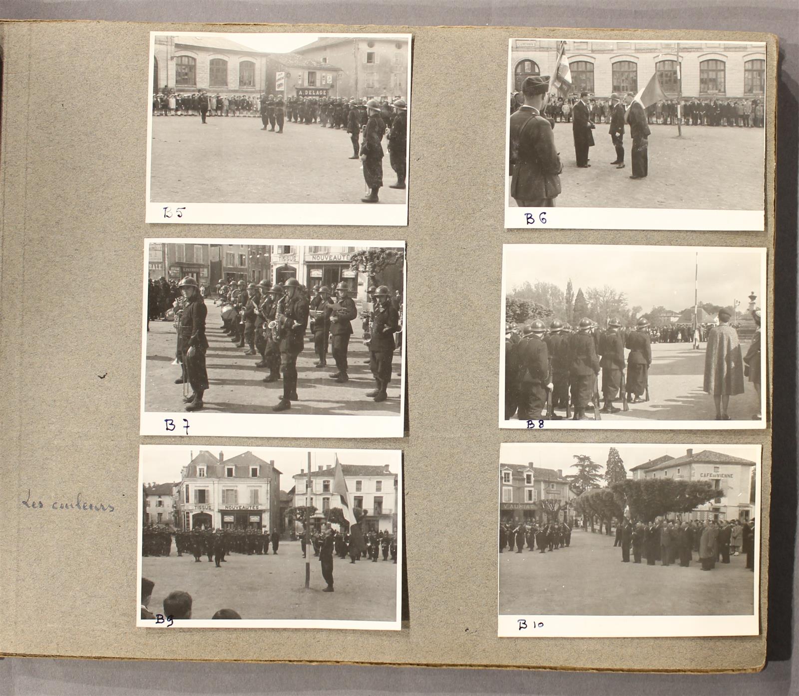 [MILITARIA - CHARENTE] - AUBINEAU (Pierre), photographe - Chabanais, journées des 7 et 8 juin 1941 - Fêtes organisées à l'occasion de la venue du 30ème B.C.P. - 1 album In-4° oblong de 187 photographies en noir et blanc contre-collées, la plupart de format 8,8x6,40 cm, certaines légendées de façon manuscrite - Scènes de fanfares, défilés, revue des troupes, sports, la Croix-Blanche, soirée artistique : théâtre - Reliure cartonnage muet - Bon état.