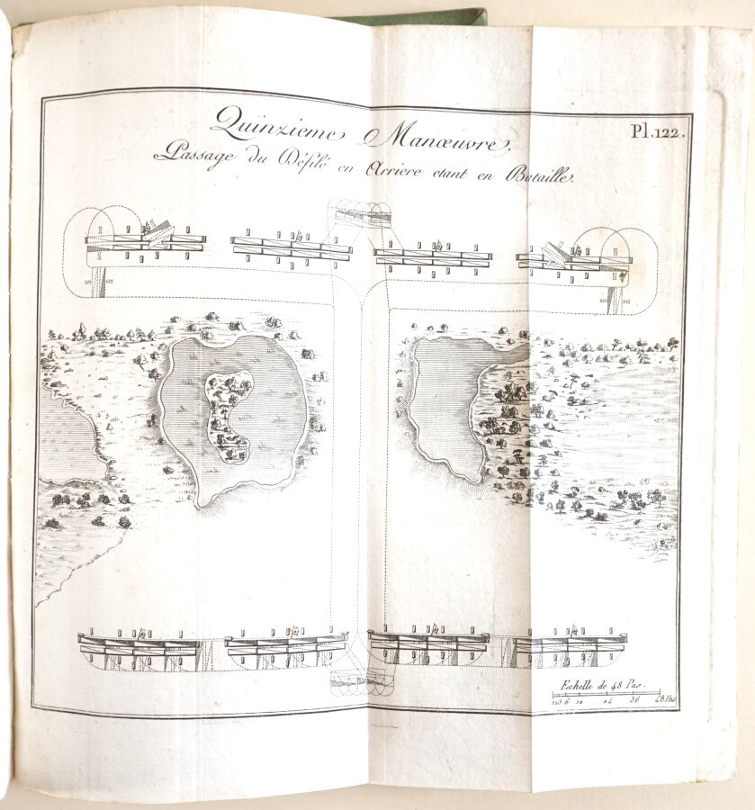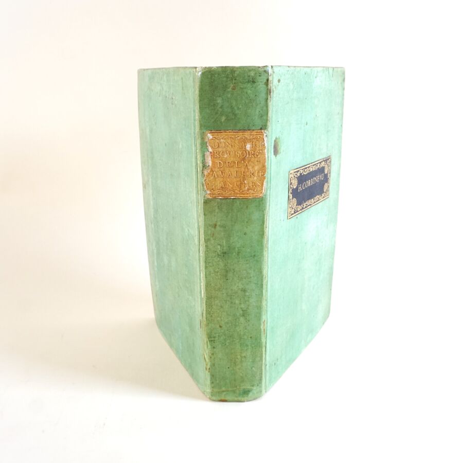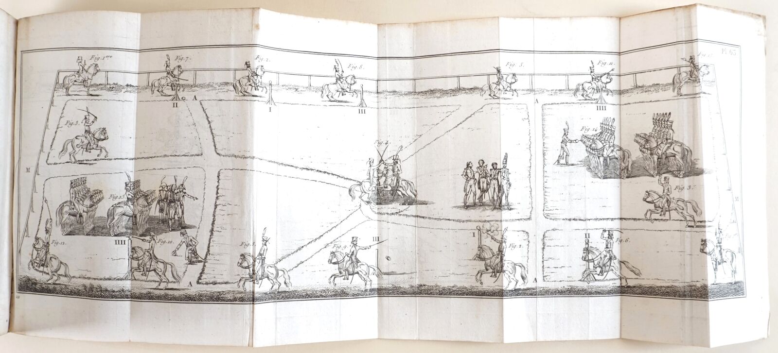[MILITARIA] - [COLLECTIF] - Ordonnance provisoire sur l'exercice et les manoeuvres de la cavalerie, rédigée par ordre du Ministère de la Guerre du 1er Vendémiaire An XIII. Planches - Paris ; Magimel, An XIII-1804 - 1 volume In-8° - Atlas seul - 127 planches gravées, dont de nombreuses dépliantes - Agréable reliure de l'époque vélin vert (rares petites taches au 1er plat) - Dos lisse - Pièce de titre papier beige (petits manques) - Tête mouchetée de brun - Super ex-libris de maroquin noir au 1er plat : H. Corbineau - Très bon exemplaire.