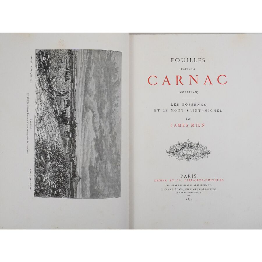 MILN (James). Fouilles faites à Carnac (Morbihan). Les Bossenno et le Mont-Saint-Michel. Paris, Didier et Cie, J. Claye et Cie, 1877. In-4, demi-chagrin rouge, dos à nerfs orné, couv. et dos conservés (reliure moderne).