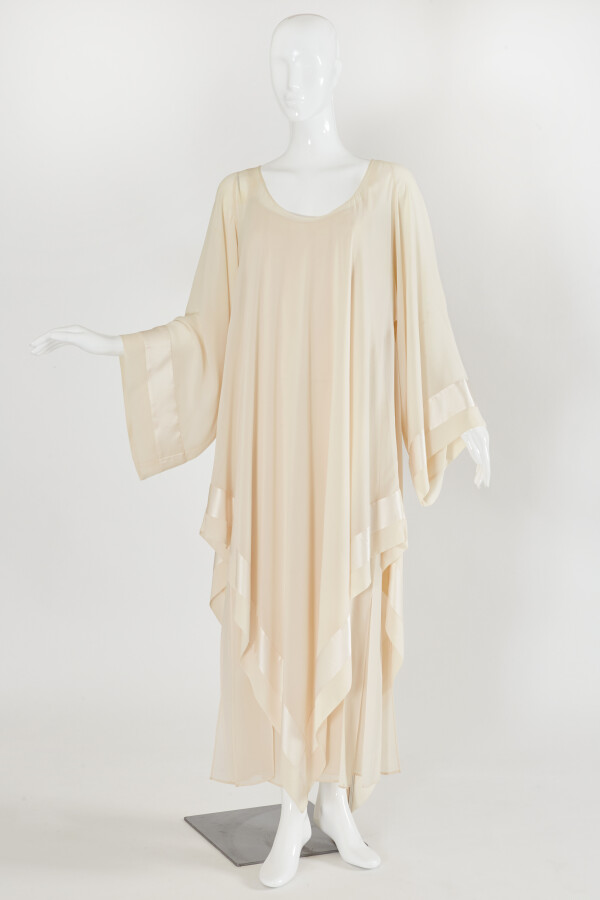 Tunique en pointe en georgette blanche bordée d'une bande de soie, grand décolleté rond, manches kimono, attache par 3 boutons de tissu sur l'épaule gauche.