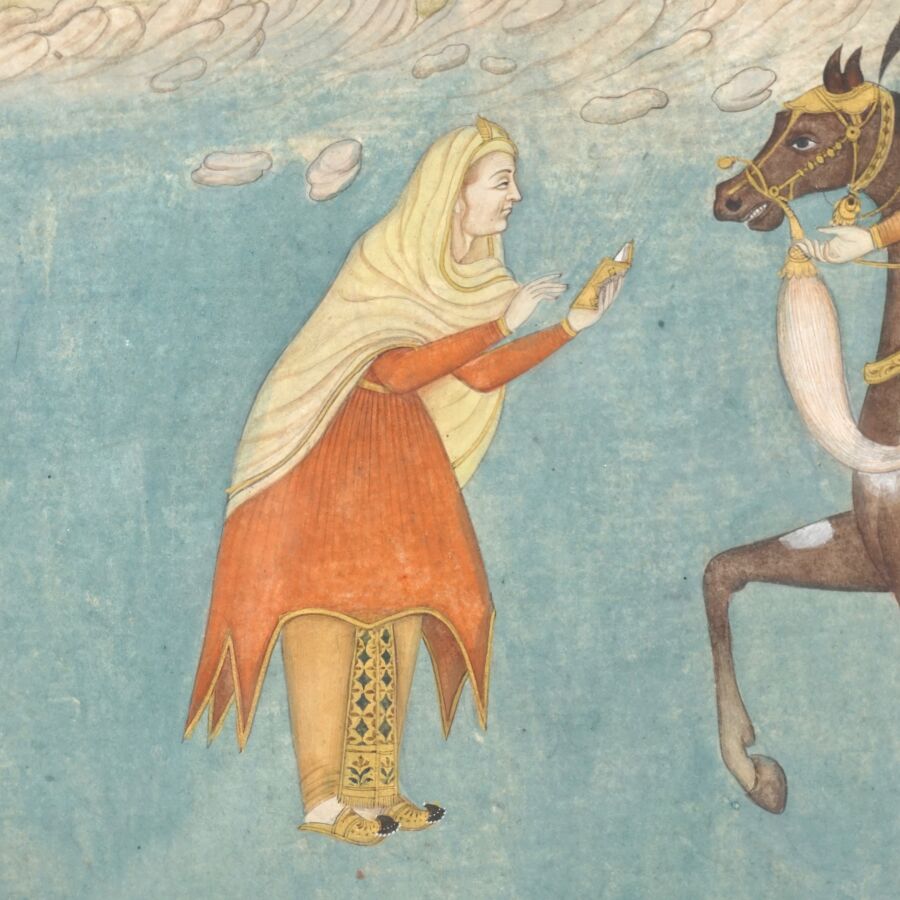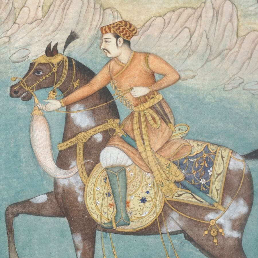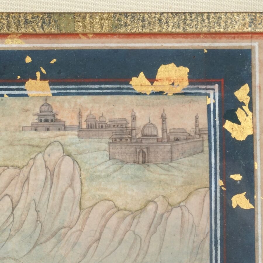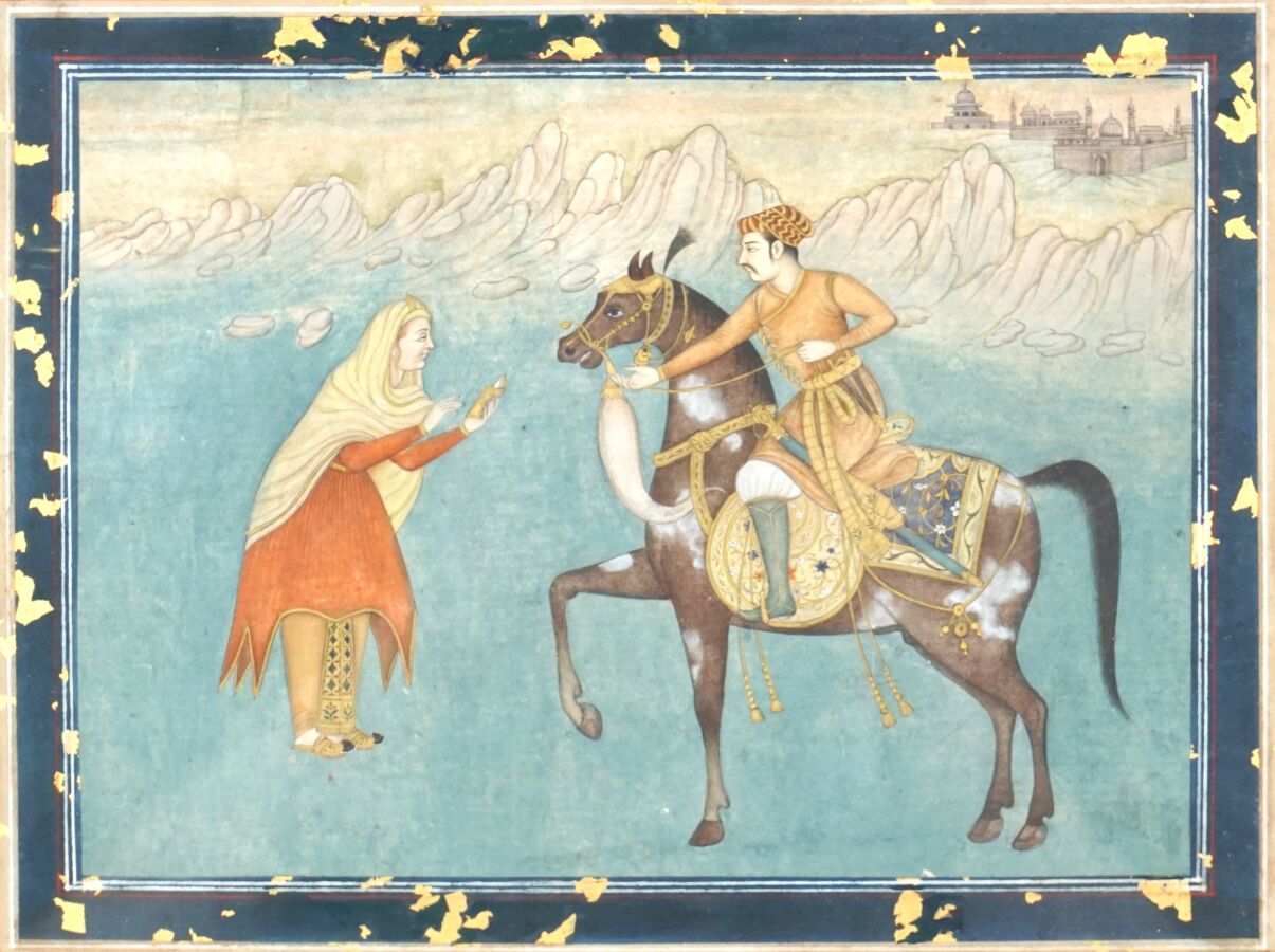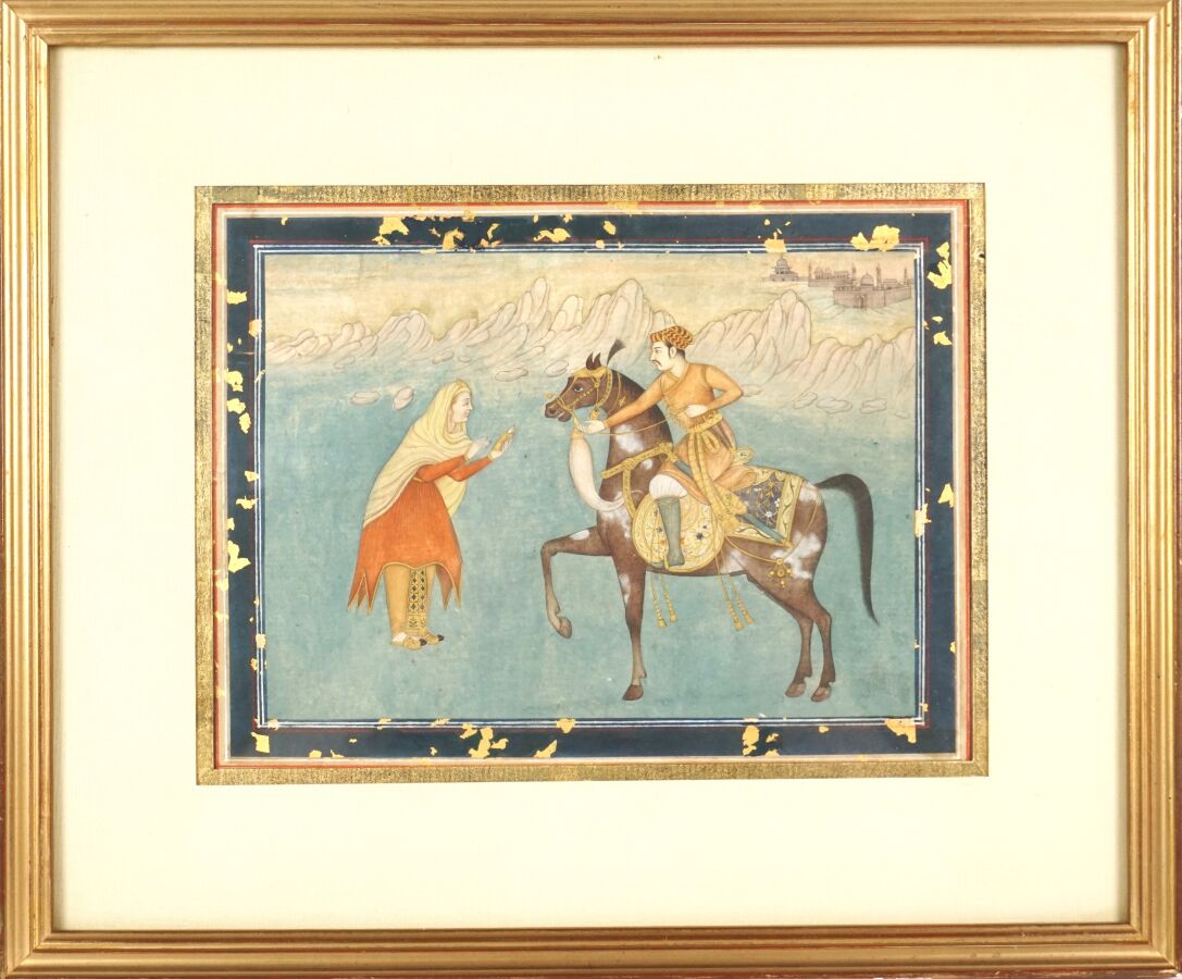 Miniature peinte sur papier et rehauts d'or figurant un cavalier devant une femme sur fond de paysage montagneux, Inde 18ème siècle, 17 x 23 cm (à vue).