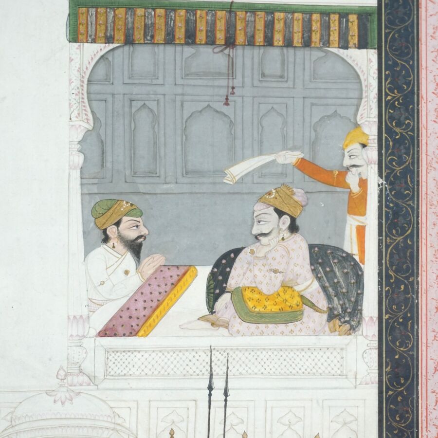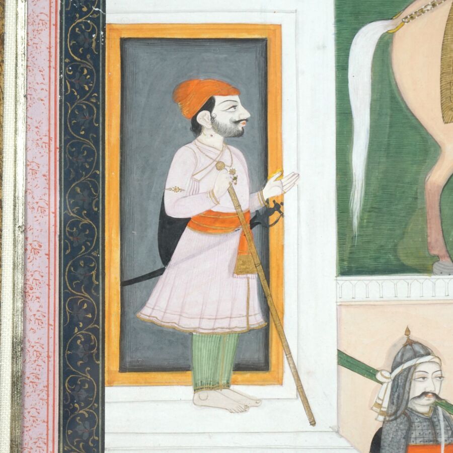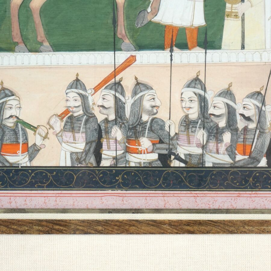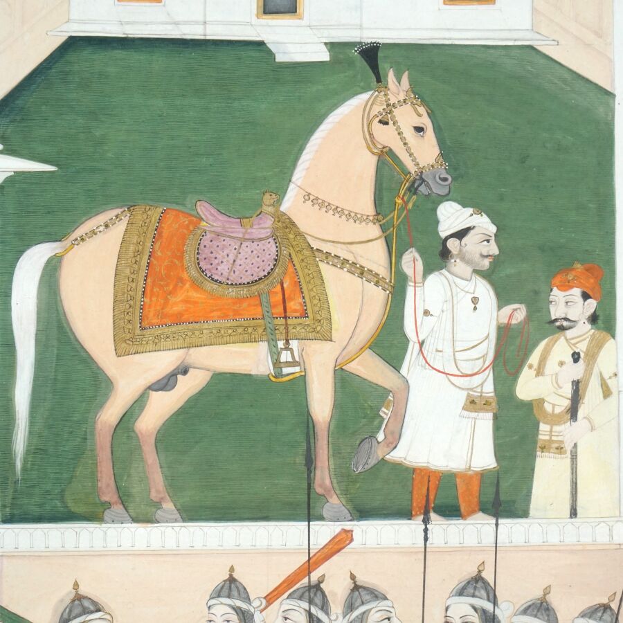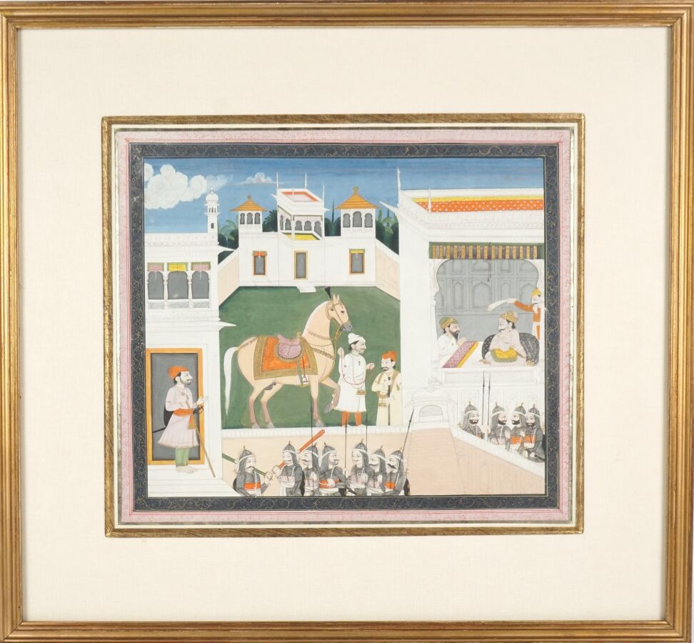 Miniature peinte sur papier et rehauts d'or figurant un homme tenant son cheval dans un décor architecturé, Inde, 18ème siècle, 24 x 27.5 cm (à vue).