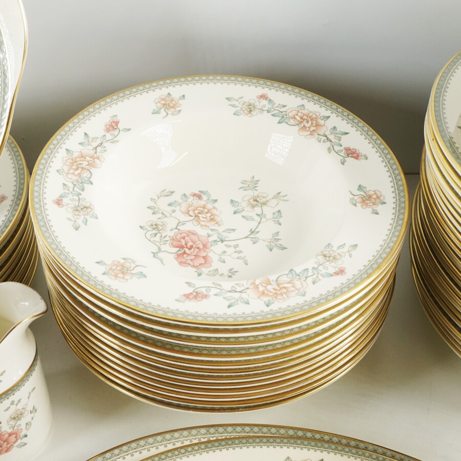 MINTON : Partie de service de table du modèle "Jasmine" en faïence émaillée polychrome à décor de fleurs rose sur fond ivoire, comprenant : 24 assiettes plates, 12 assiettes creuses, 12 assiettes à entremets, 12 assiettes à dessert, 1 légumier, 1 plat ovale creux, 12 tasses et sous-tasses, 1 verseuse, 1 pot à lait, 1 sucrier, 2 plats ovales, 1 plat à anses et 1 saucière, D. Assiettes plates : 27 cm.