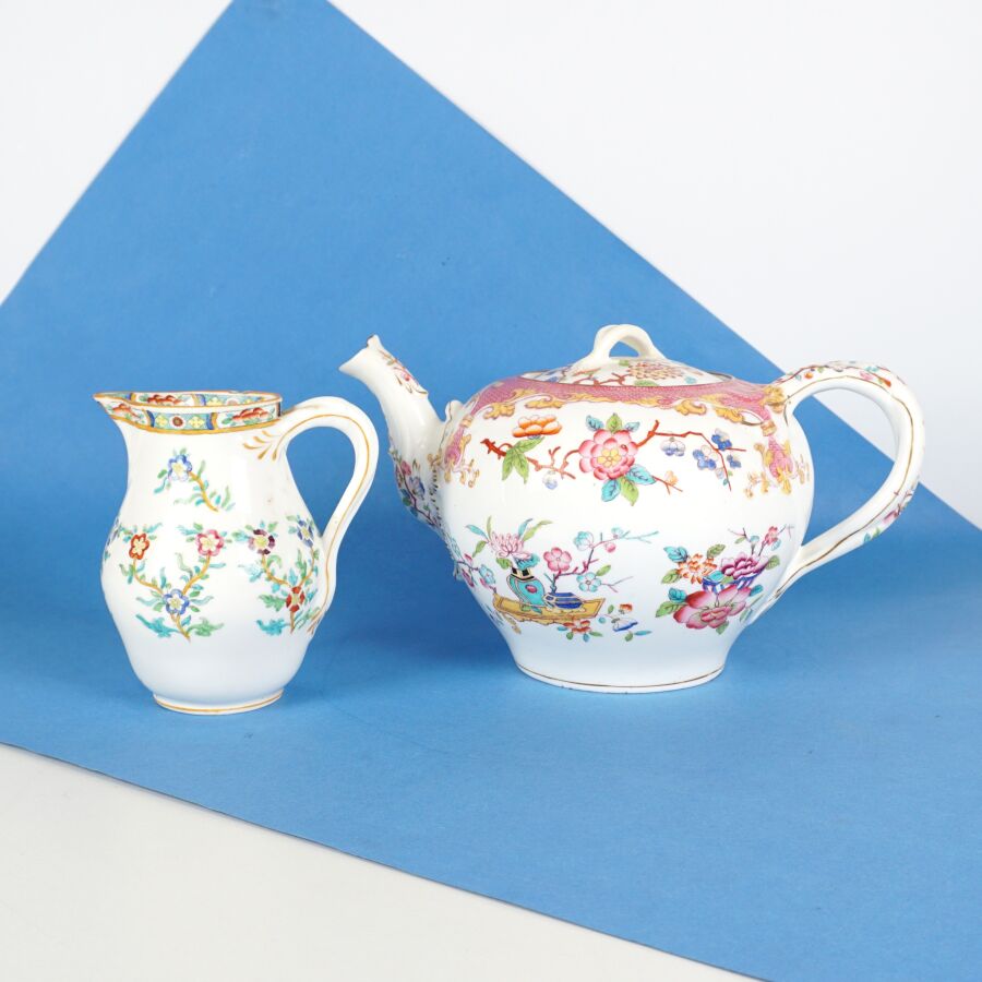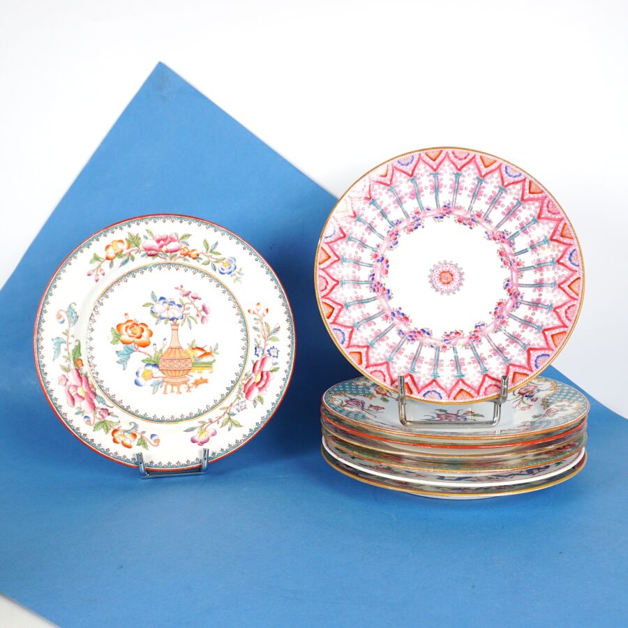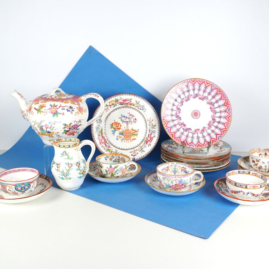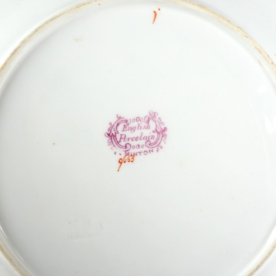 MINTON : Partie de service en porcelaine émaillée polychrome à décor floral comprenant 8 assiettes à dessert dépareillées, un pot à lait, une théière, 5 tasses et sous-tasses, marqués dessous, début 20ème siècle, H. Théière : 13.5 cm. D. Assiette : 20 cm.