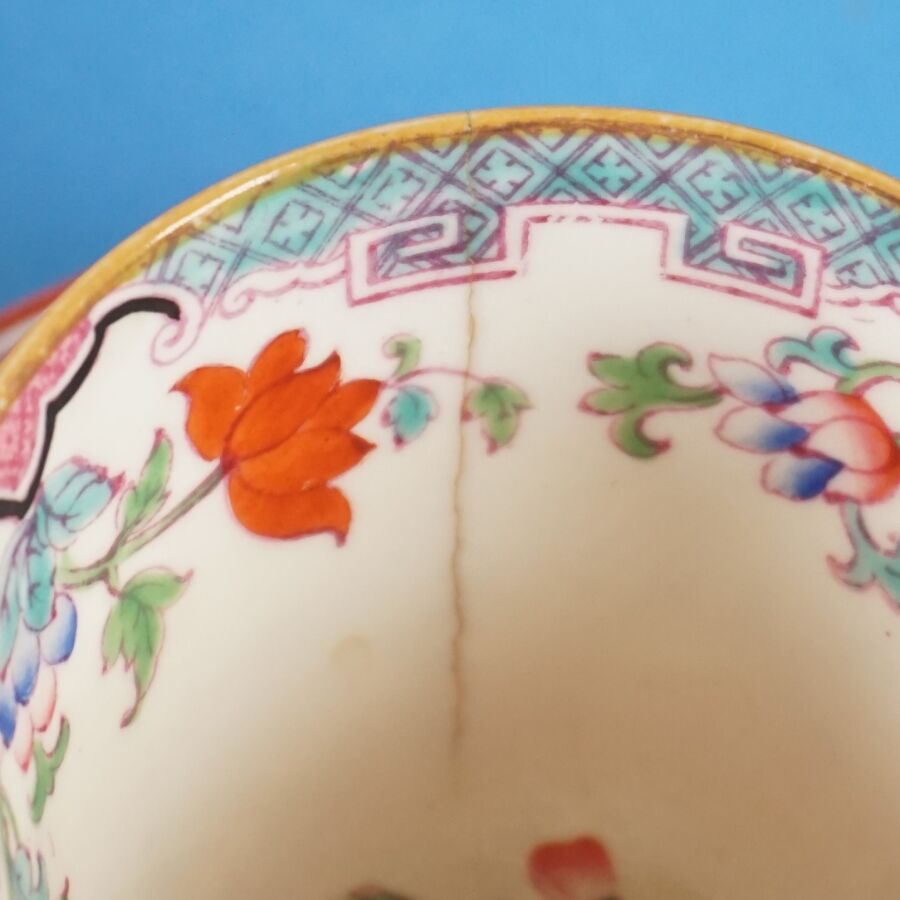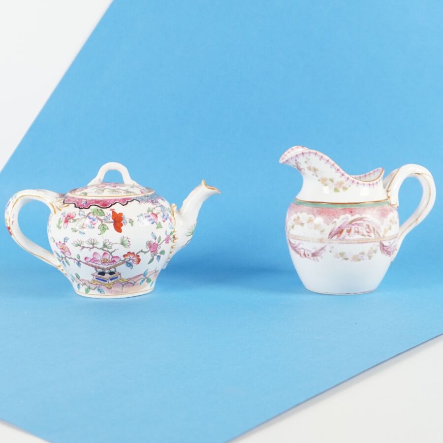 MINTON : Service à thé en porcelaine émaillée polychrome à décor de fleurs, comprenant 10 tasses et sous-tasses, 1 verseuse et 1 pot à lait d'un modèle similaire (accidents, fêles).