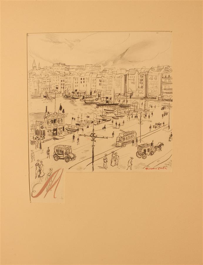 MIOMANDRE (Francis de) - GRAU SALA (Emilio) - Ecrit sur de l'eau - Paris ; Emile-Paul frères, 1947 - 1 volume grand In-4° en feuillets sous couverture illustrée, chemise titrée au dos et emboîtage éditeur (partiellement fendu) - 32 eaux-fortes en couleurs de Grau Sala : 1 sur la couverture, 1 frontispice et 30 in-texte dont 15 à pleine page - Exemplaire numéroté sur vélin d'Arches : (7 sur 50) et un des vingt 1ers comprenant 1 dessin original de l'artiste réalisé pour cet ouvrage, 1 suite en 1er état et 1 suite avec l'état définitif des eaux-fortes (tirage total : 400) - Bon exemplaire enrichi de 2 dessins originaux signés.