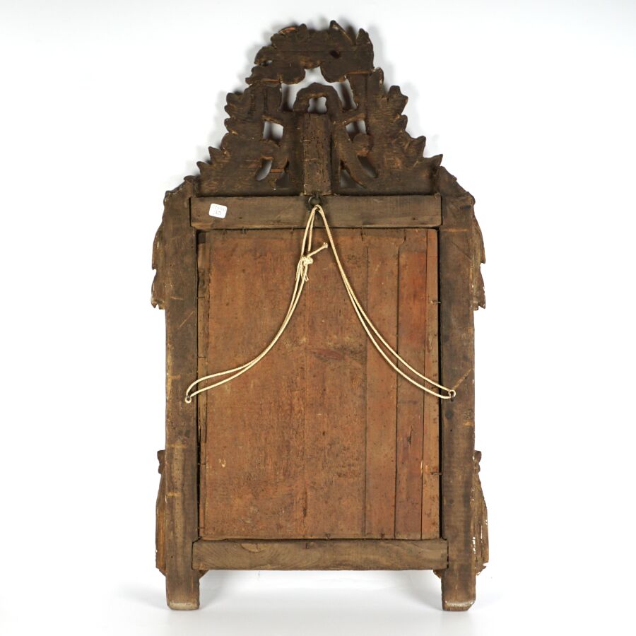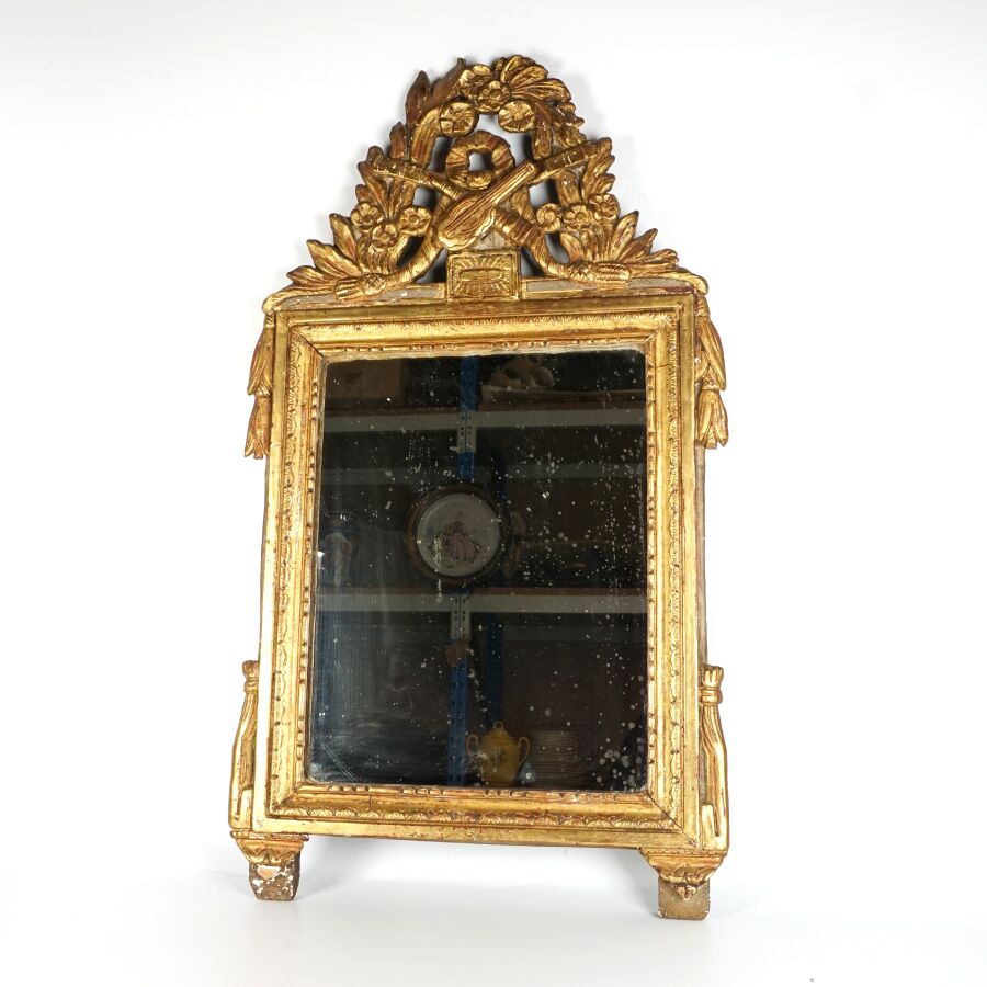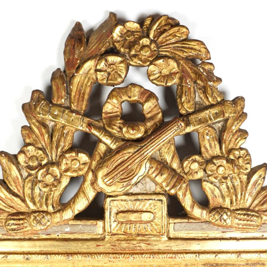 Miroir à fronton en bois stuqué doré à décor d'instruments musicaux et de végétaux, début 19ème siècle, Dim. Totales : 80 x 45 cm (manques, usures).