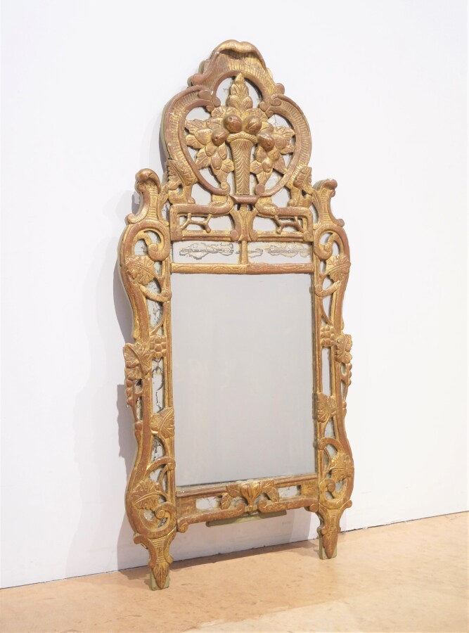 Miroir à parecloses de forme mouvementée, le fronton à décor d'un panier de fruits, l'encadrement à décor de pampres de vigne, glace au mercure, 129 x 64 cm.
