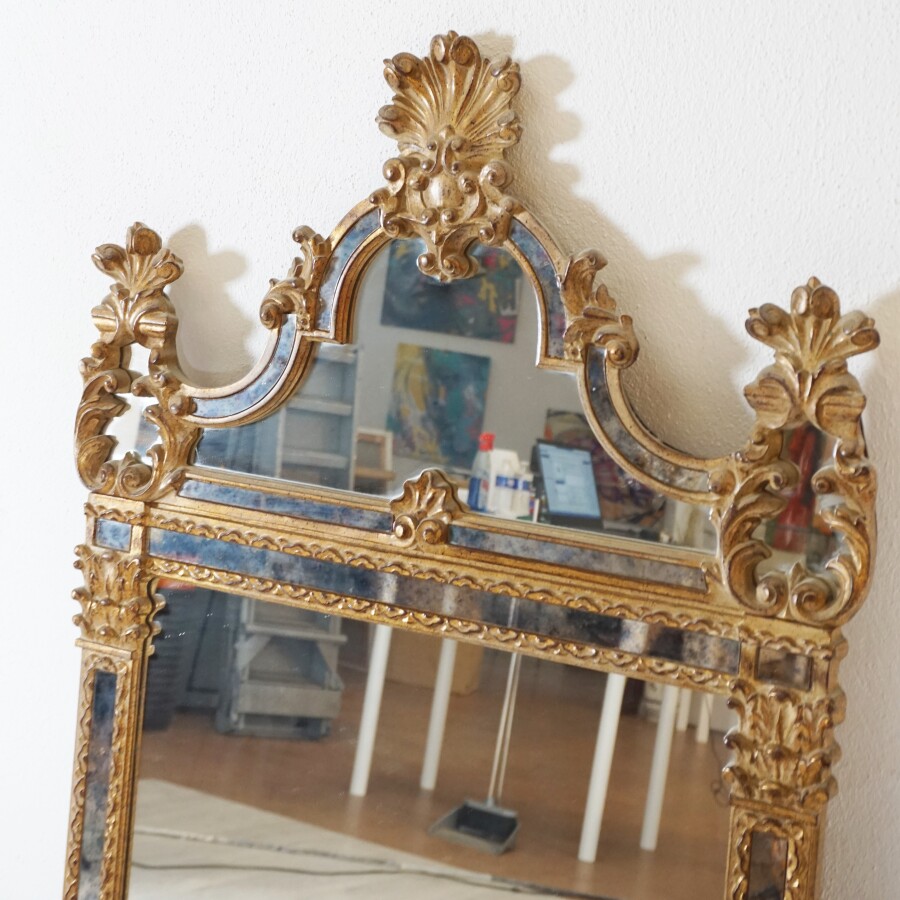 Miroir à parecloses en stuc doré à riche décor de coquilles, H. 125 x 65 cm.