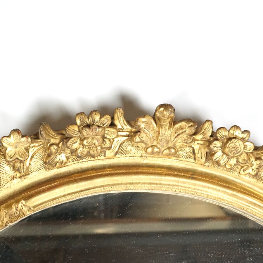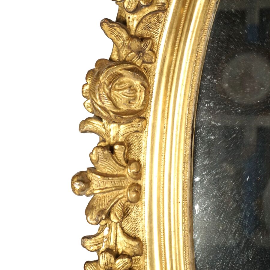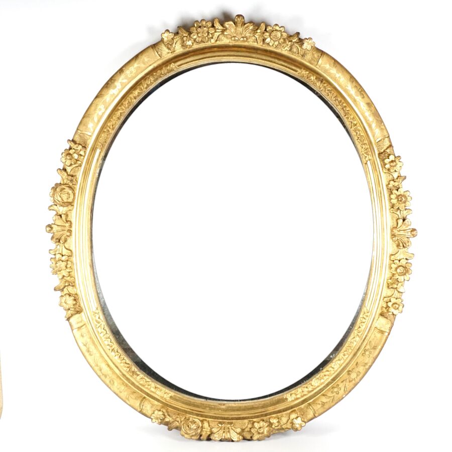 Miroir de forme ovale en bois sculpté et doré à décor de bouquets de fleurs et de feuillages, 19ème siècle, 96 x 83 cm (usures).