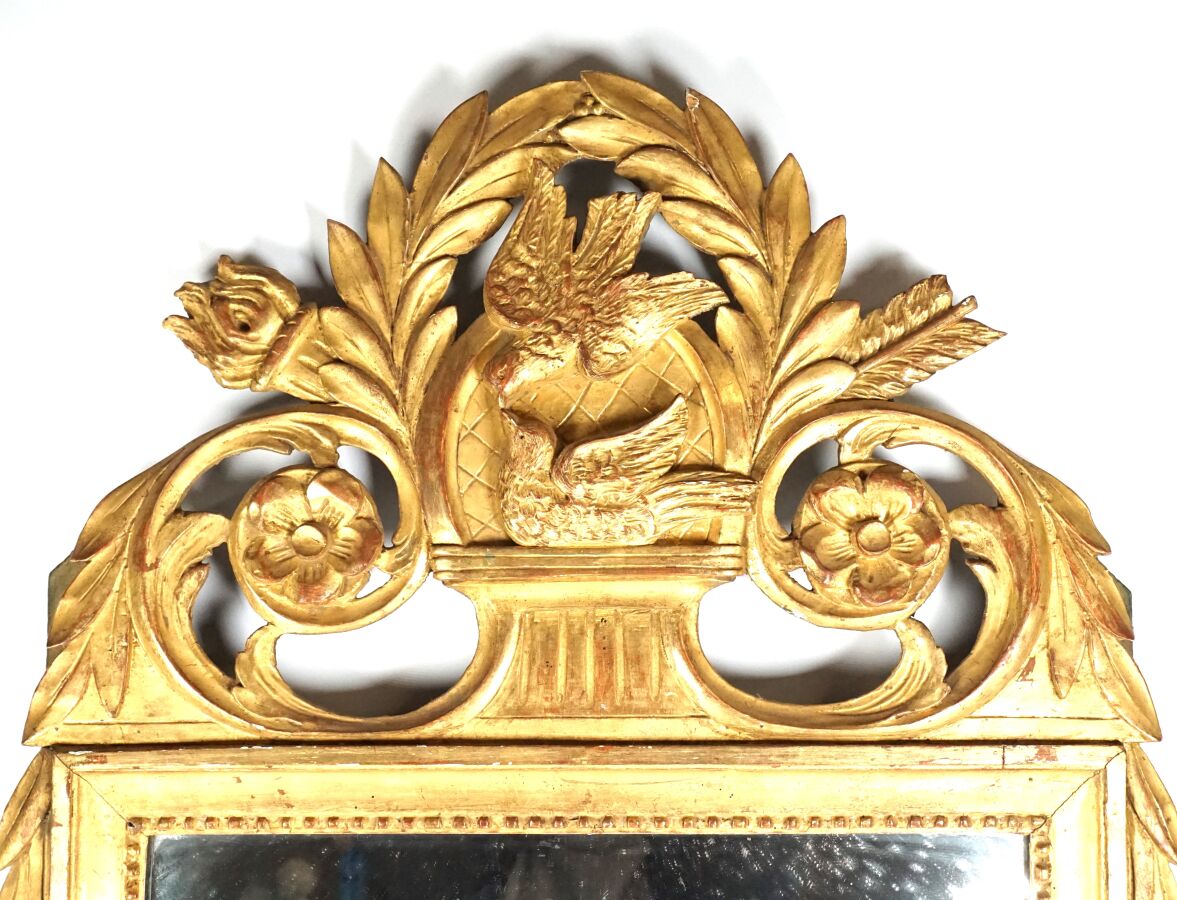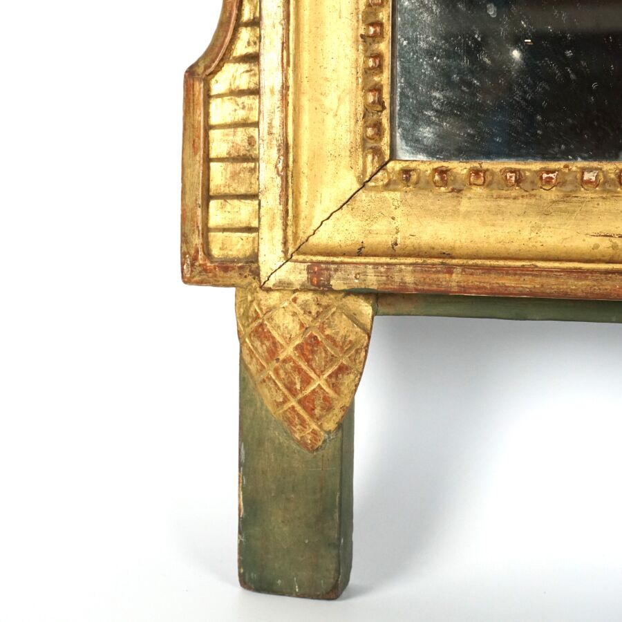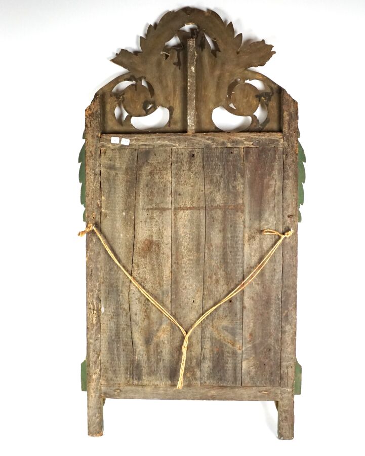Miroir de forme quadrangulaire en bois doré et laqué vert, à décor sculpté d'une frise perlée en pourtour, le fronton richement orné d'un couple de colombes parmi des feuillages, seconde moitié du 18ème siècle, Dim. Totale : 110 x 61 cm (usures).