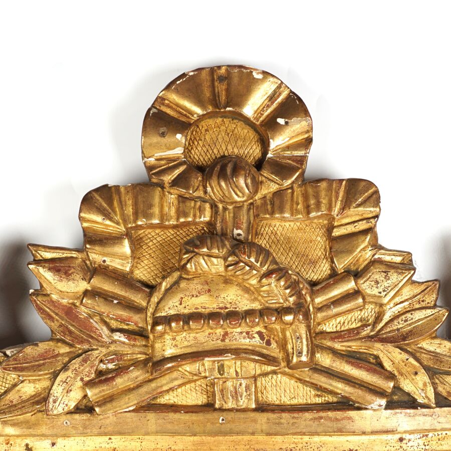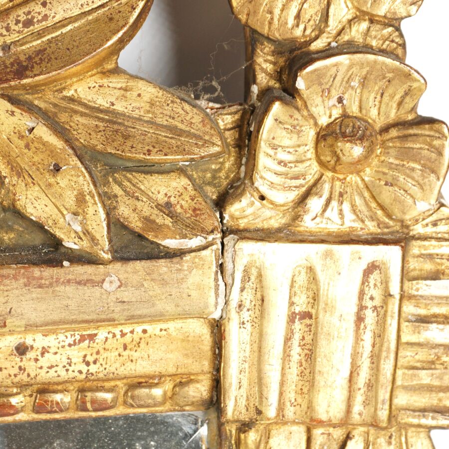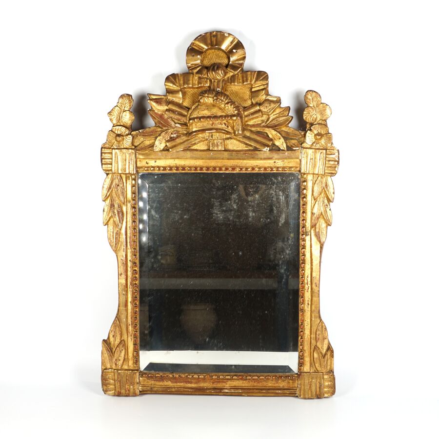 Miroir en bois doré à décor d'une frise perlée, le fronton à décor de feuillages, casque et noeud stylisé, glace biseautée, 18ème siècle, 71 x 45 cm (manques).