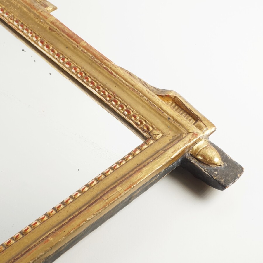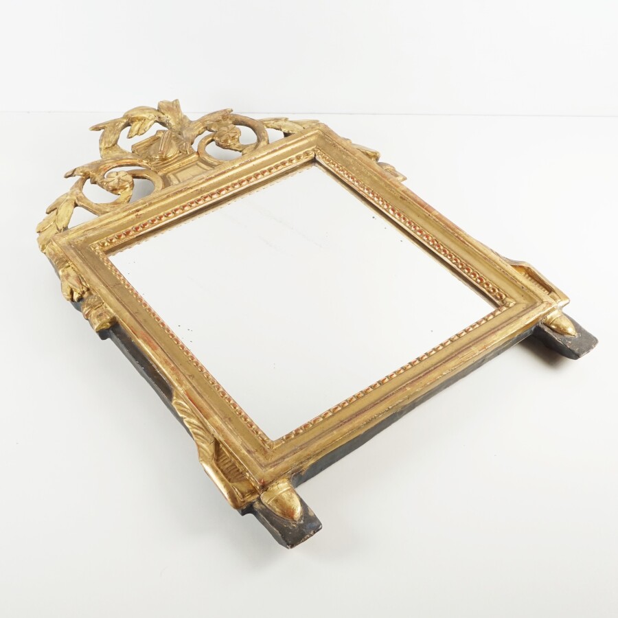 Miroir en bois doré, époque 18ème siècle, à décor perlé et lauriers et instruments stylisés à l'amortissement, 54 x 39 cm.