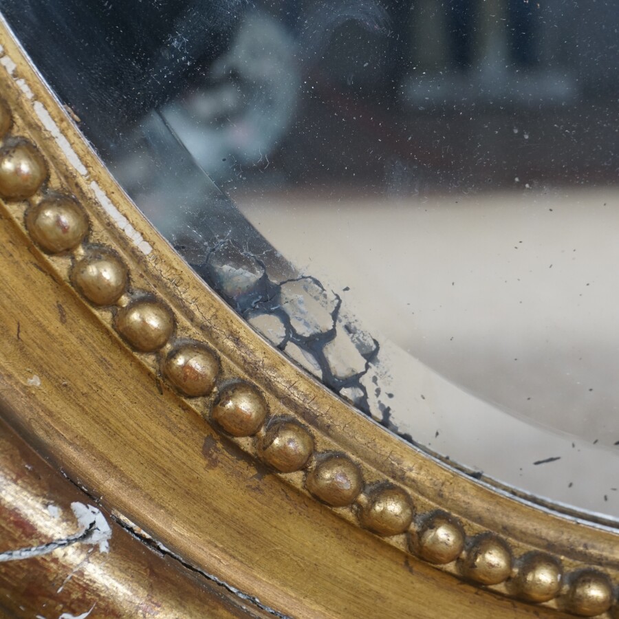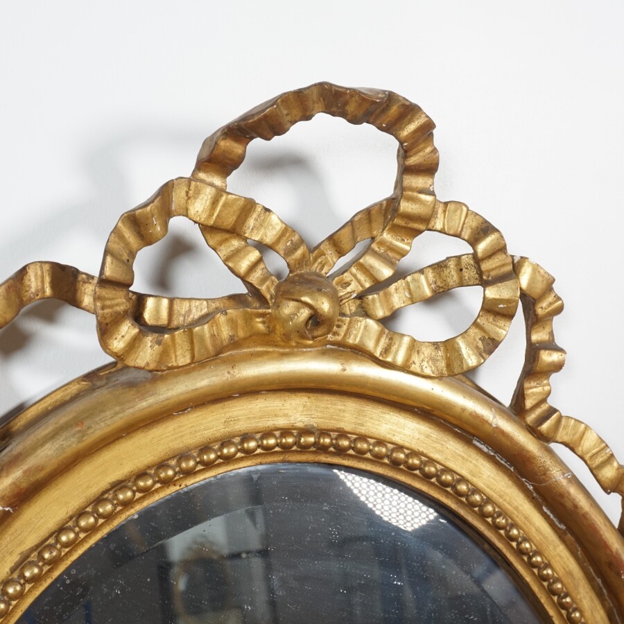 Miroir ovale, bois doré et sculpté, surmonté d'un Noeud "Marie-Antoinette", H. 102 cm x L. 72 cm (accidents, manques).
