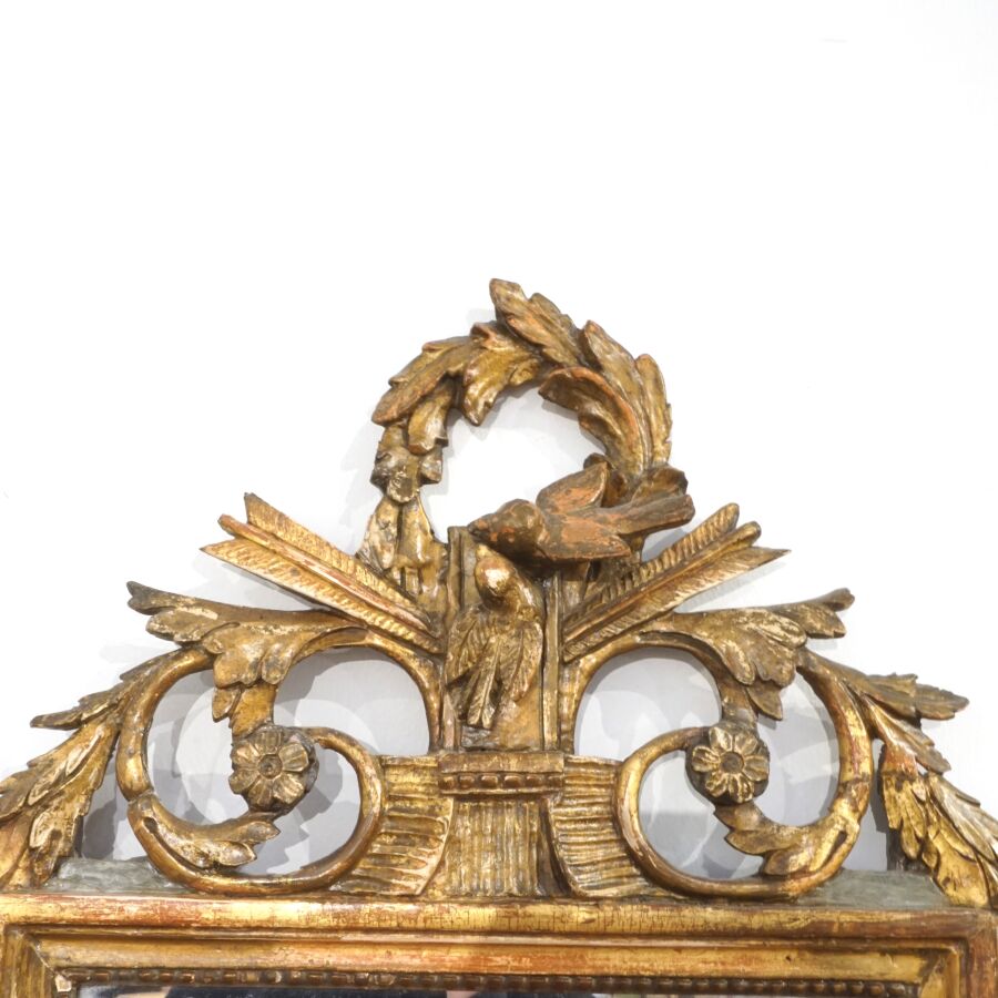 Miroir rectangulaire, fronton en bois sculpté à décor d'oiseaux, début du 19ème siècle, H. 87 cm. L. 49 cm (usures).