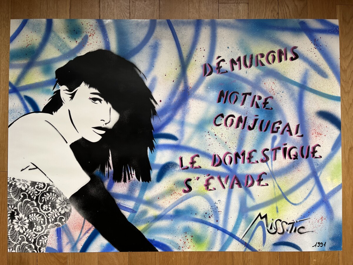 MISS.TIC (1956-2022), "Démurons notre conjugal..." 1991, peinture à l'aérosol et pochoir sur papier, signée et datée en bas à droite, 70 x 100 cm.