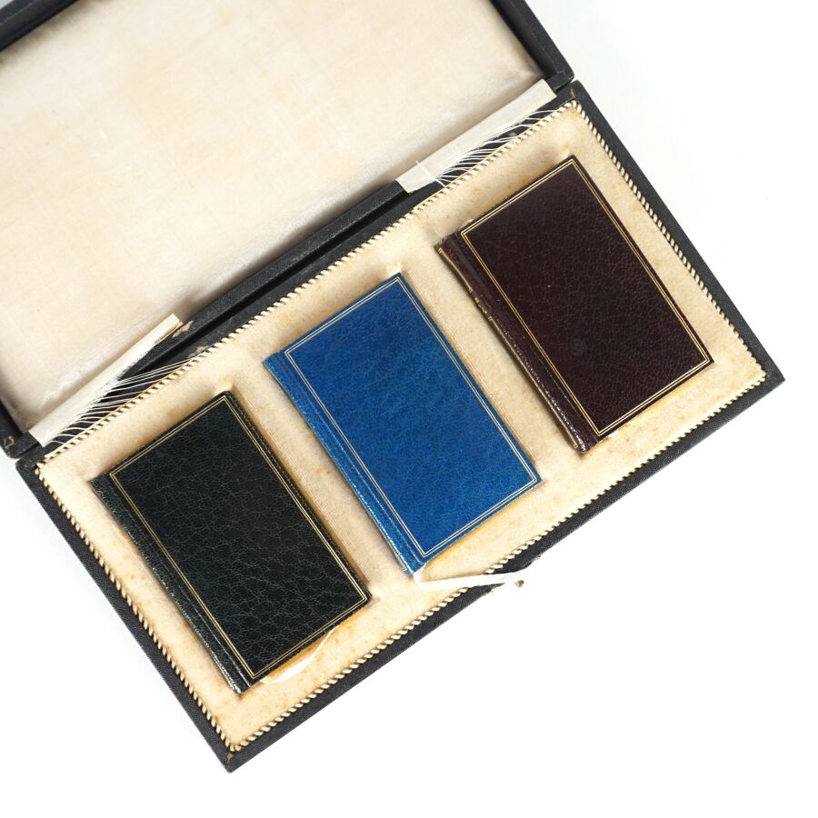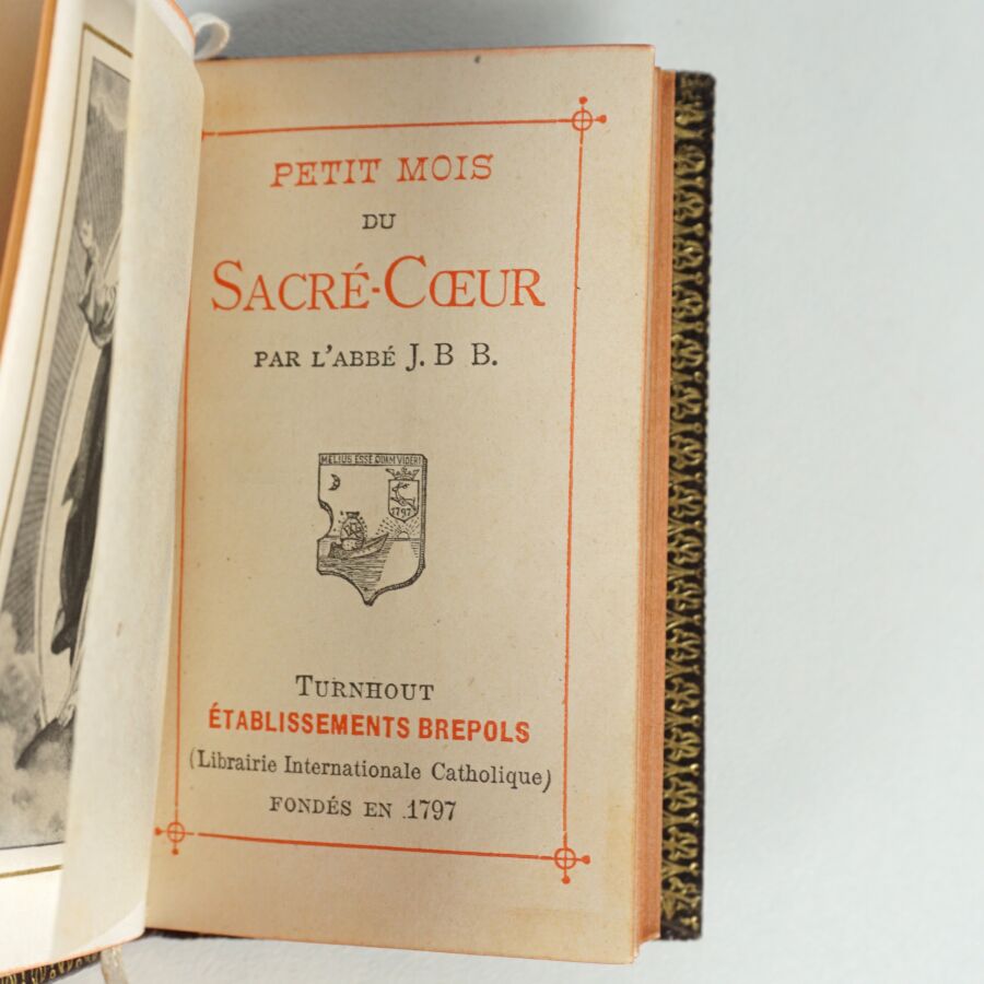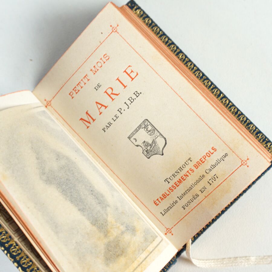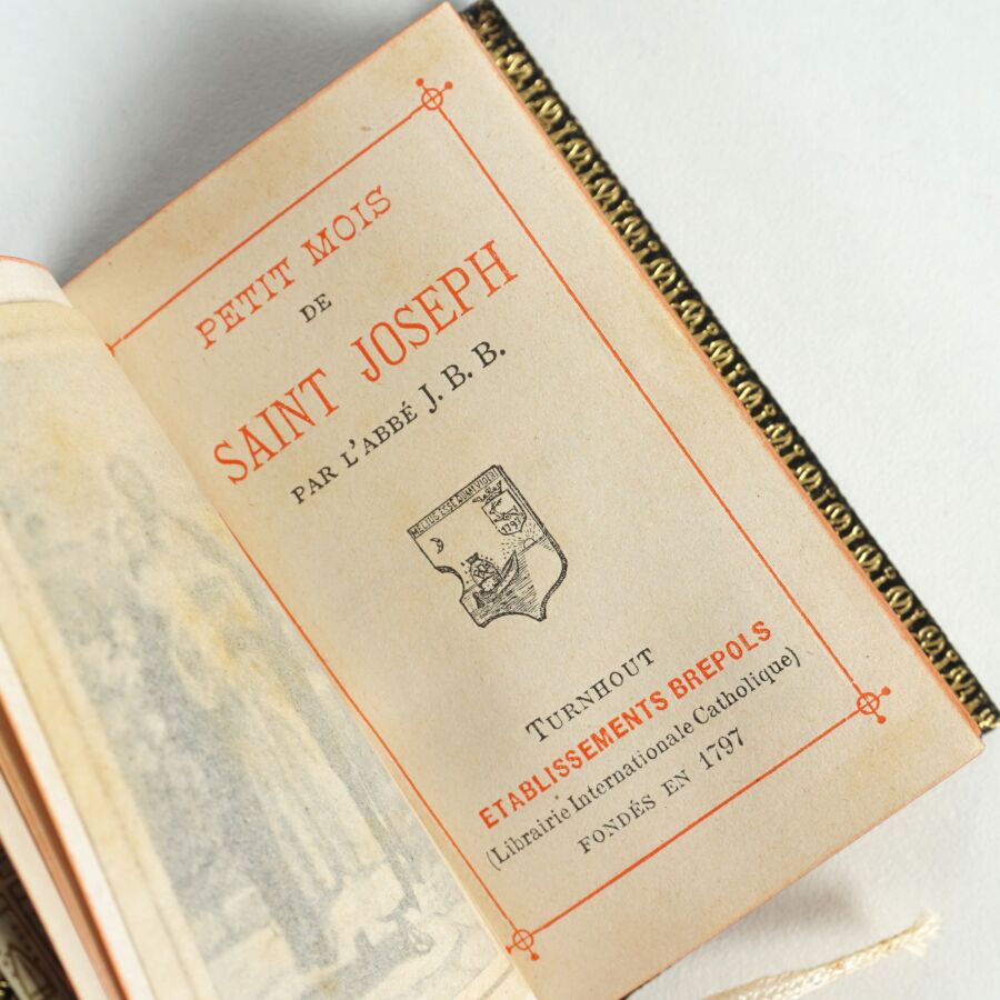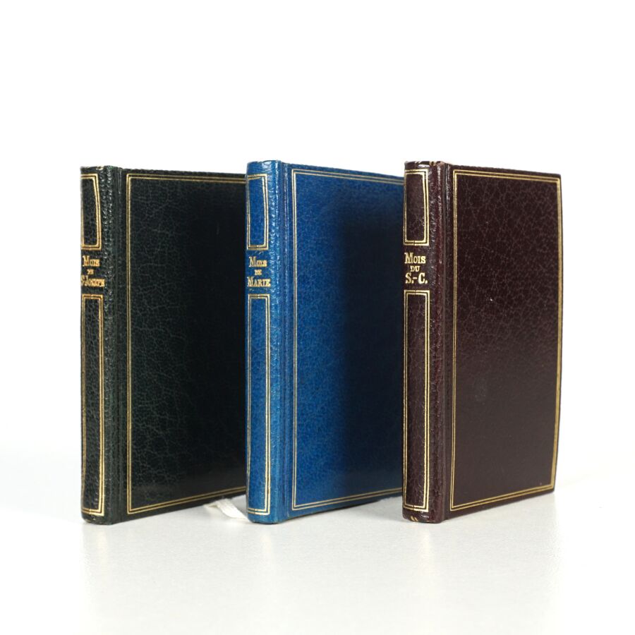 Missels. Ensemble de 3 petits livres religieux joliment reliés dans un coffret commun : Petit mois de Saint Joseph par l'abbé J.B.B. - Petit mois de Marie - Petit mois du Sacré Coeur. Turnhout, Brepols, 1898. 3 petits volumes in-16 (83 x 52 mm) bradel maroquin (noir, bleu et brun), encadrement de double filet doré au dos et sur les plats, tr. dorées, insérés dans un coffret commun en percaline chagrinée noir doublé de soie et velours ivoire. Frontispices gravés. Bon état.