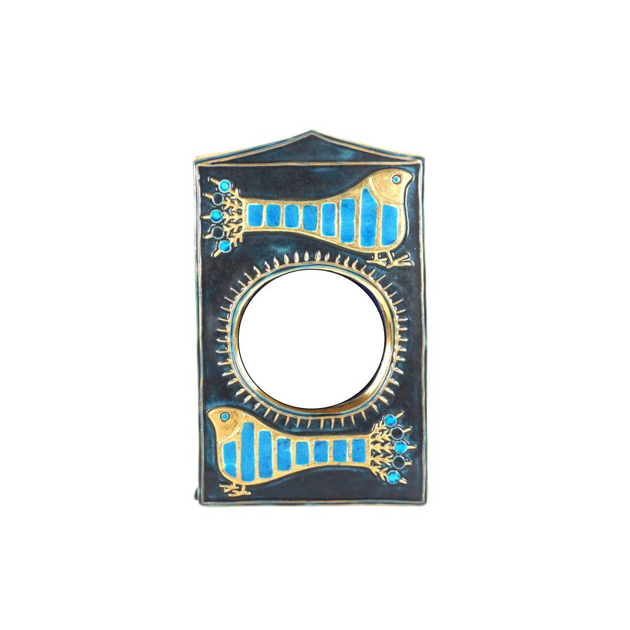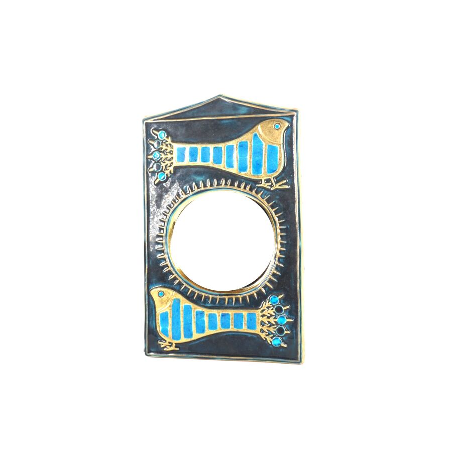 Mithé ESPELT (1923-2020), Miroir dit "Aux paons" en céramique émaillée en bleu turquoise, bleu marine et or à décor de deux paons dans un fond architecturé, Dim. 36.5 x 22.5 cm (manque au feutre à l'arrière).