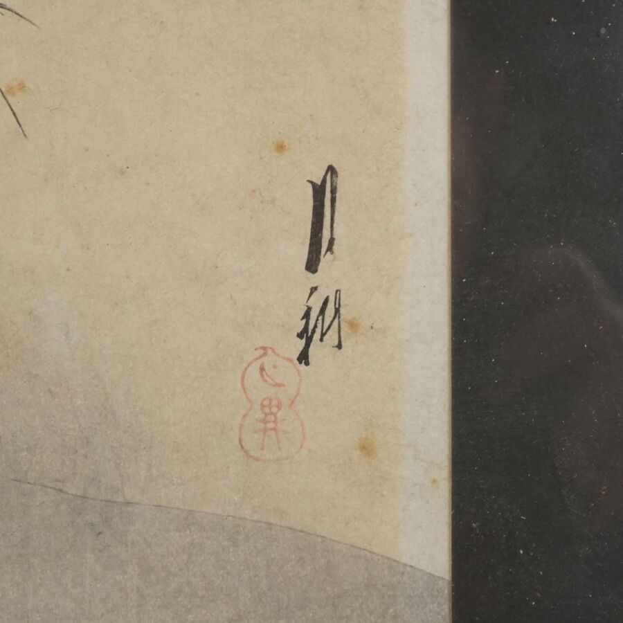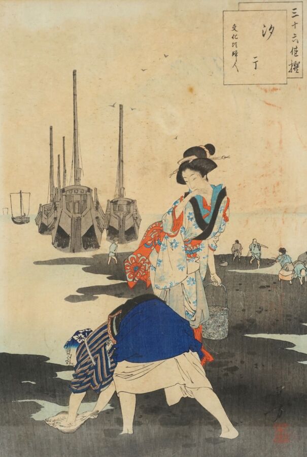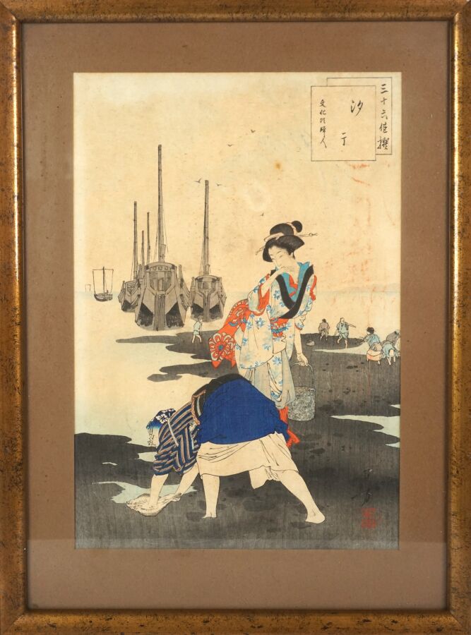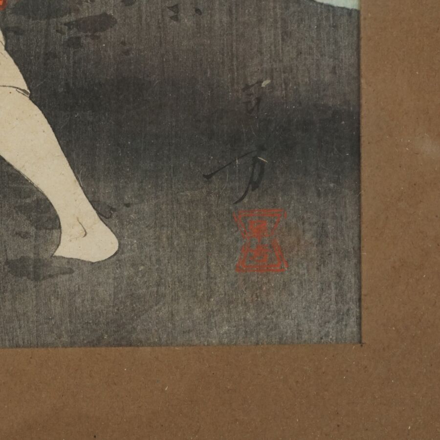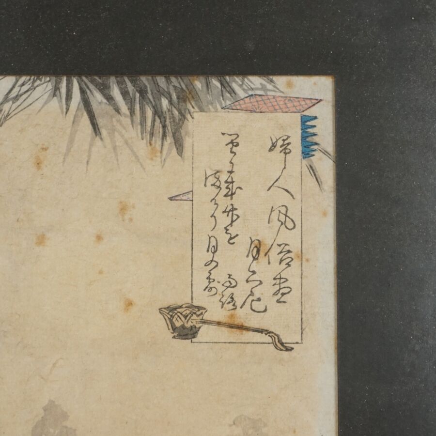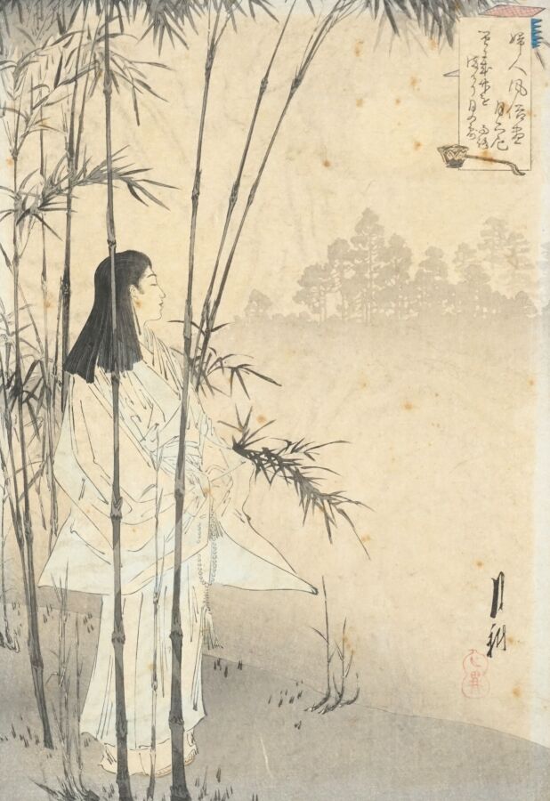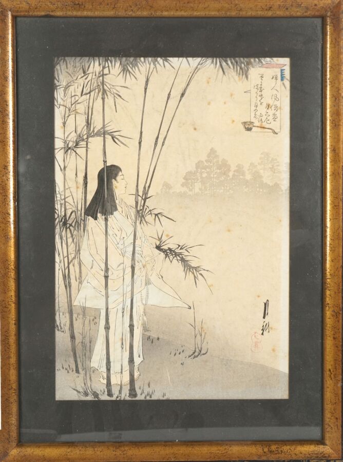 Mizuno TOSHIKATA (1866-1908), "Retour de pêche" & "Jeune femme dans une forêt de bambou", deux estampes, signées, Japon, Dim. 30.5 x 21 cm (à vue) (quelques rousseurs, petites usures aux marges).