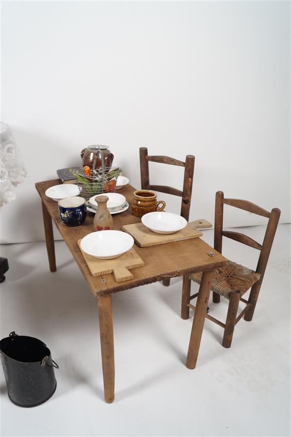 Mobilier et accessoires de cuisine et de toilette : Ustensiles en fer blanc, tôle émaillée ou faïence, avec tables et chaises en bois.