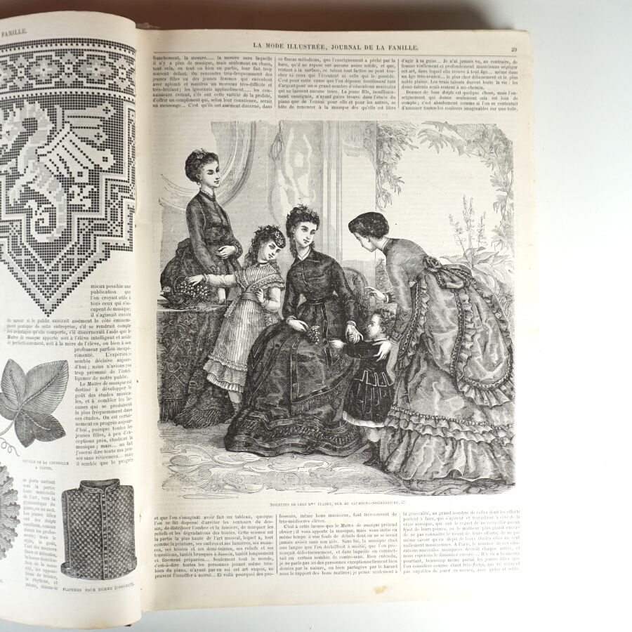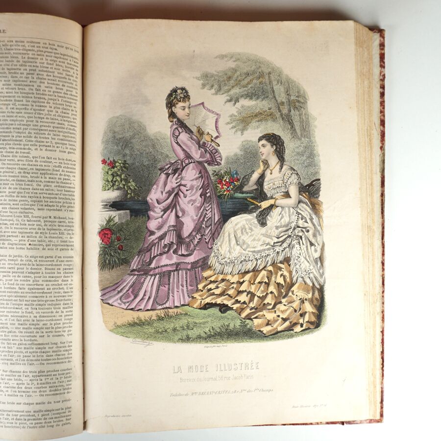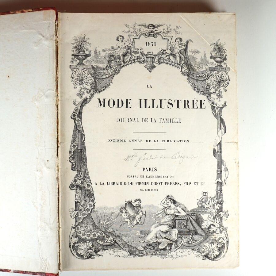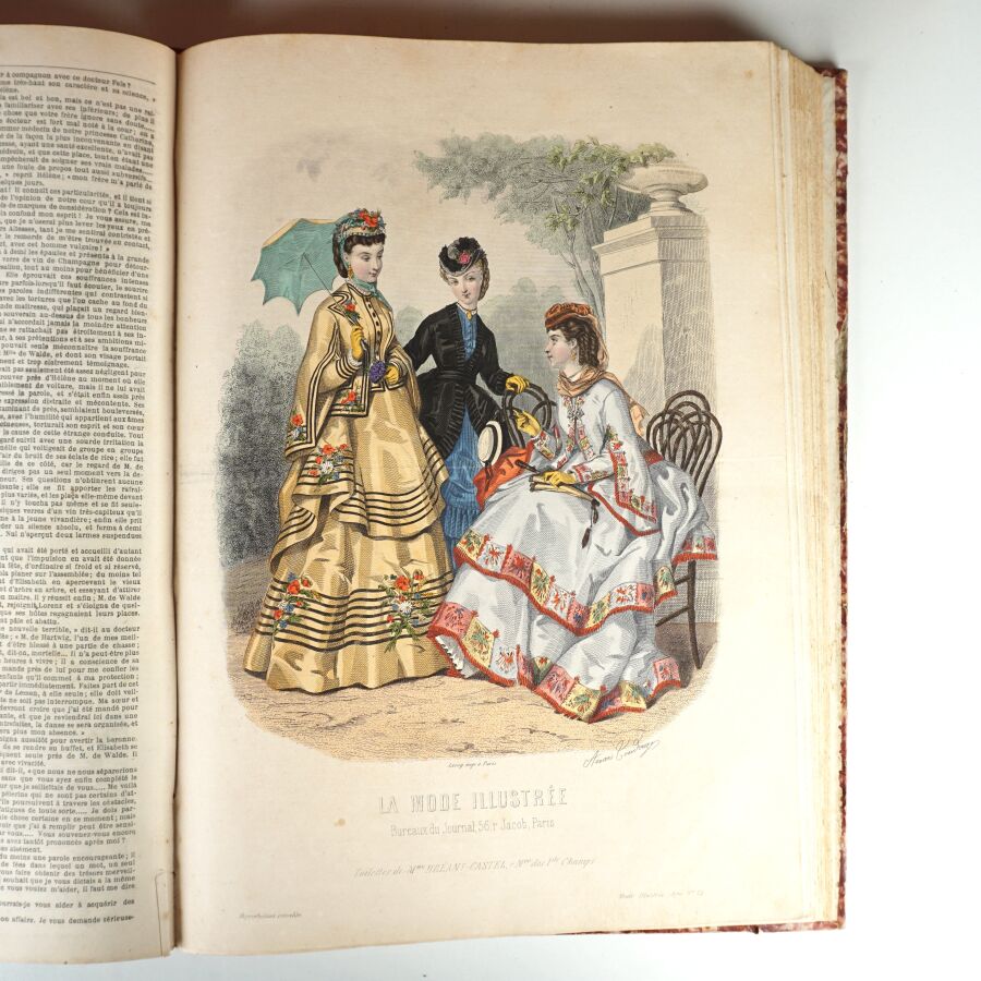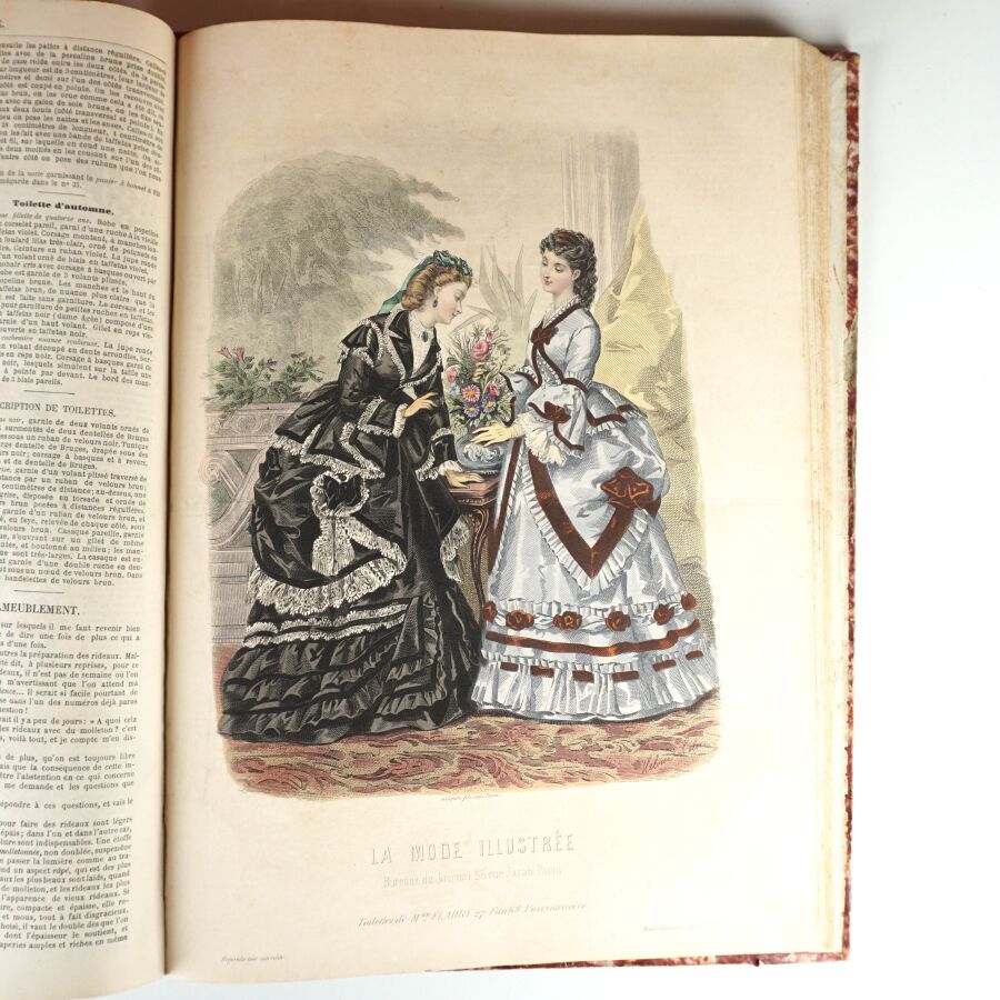 Mode illustrée (La). Journal de la famille. Onzième année de la publication. Paris, Firmin Didot frères, fils et Cie, 1870. In-folio demi-basane rouge, dos à nerfs orné, coiffes et mors frottés. 46 planches de modes gravées, en couleurs.