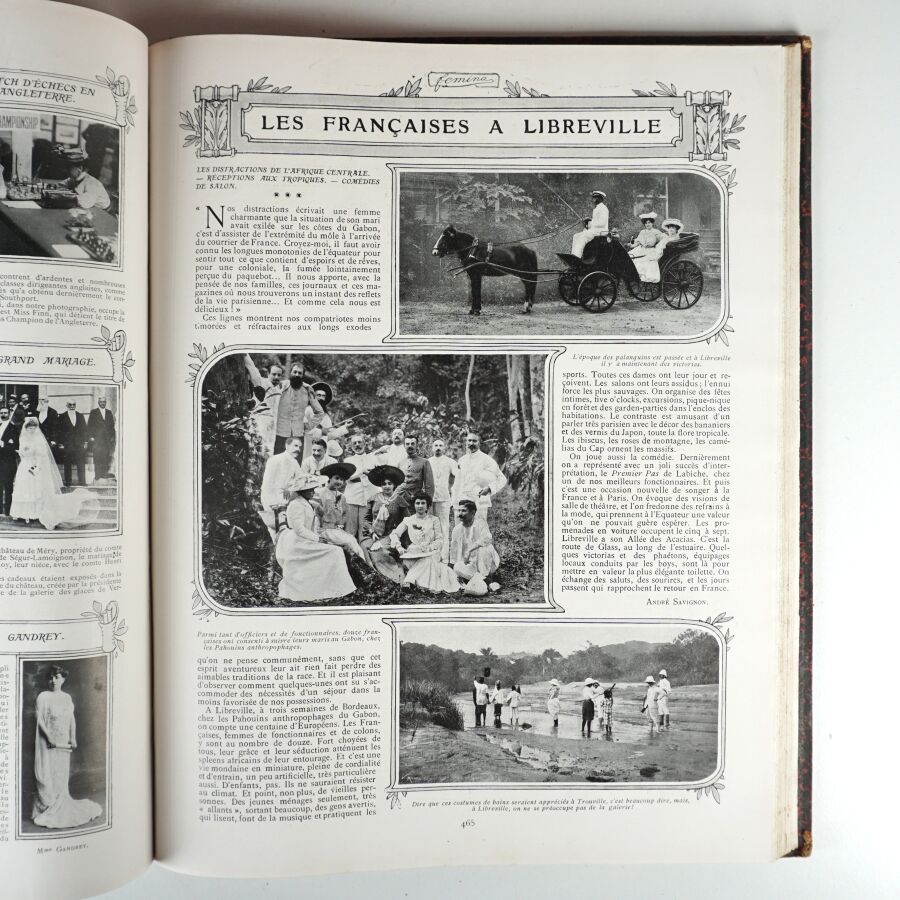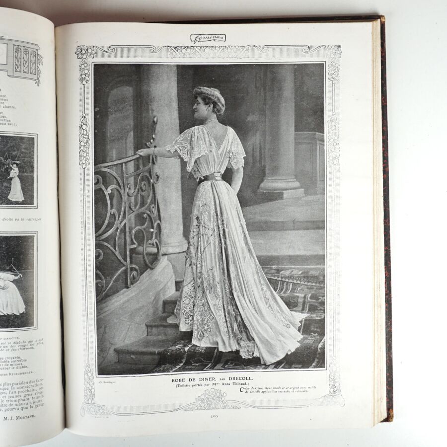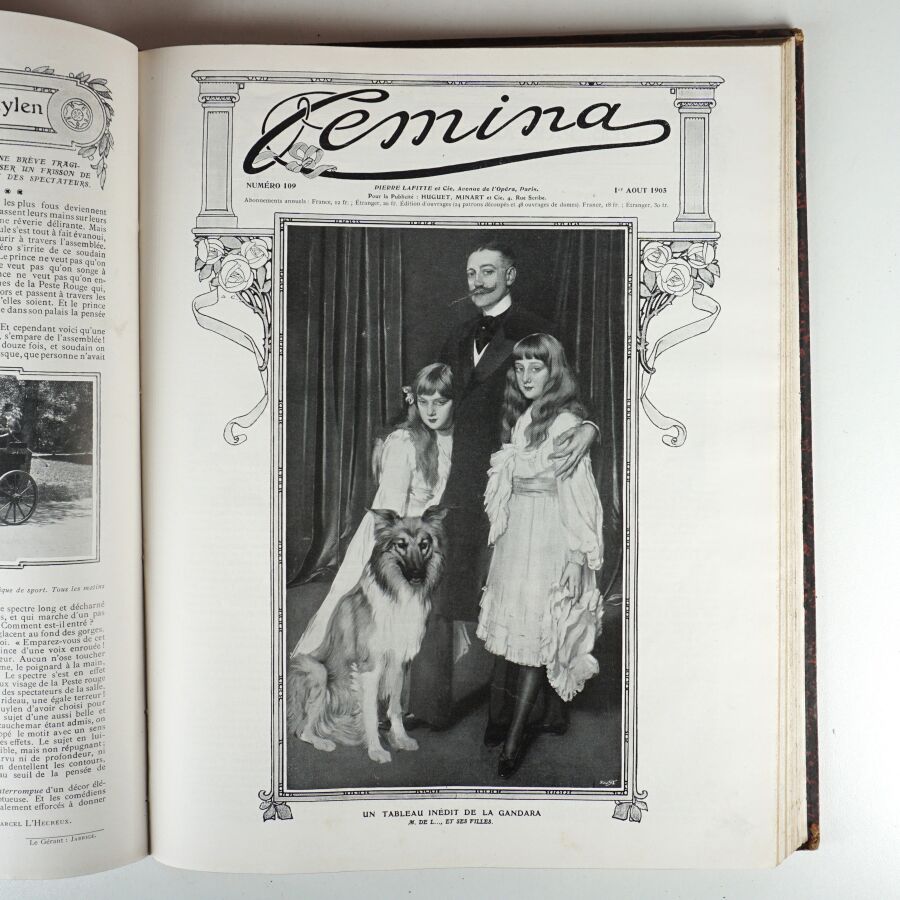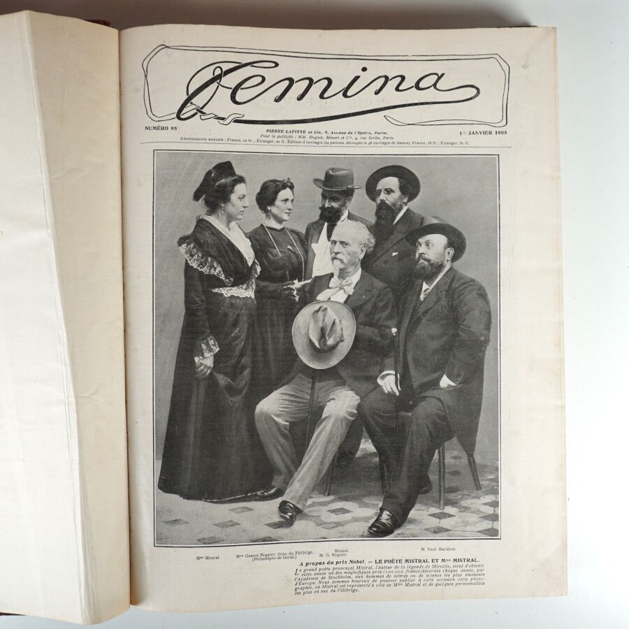 On y joint également un ensemble de 7 volumes de la revue FEMINA, in-folio en demi-basane rouge de l'époque (qqs usures), Années 1903, 1905, 1908, 1909, 1910, 1911, 1913.