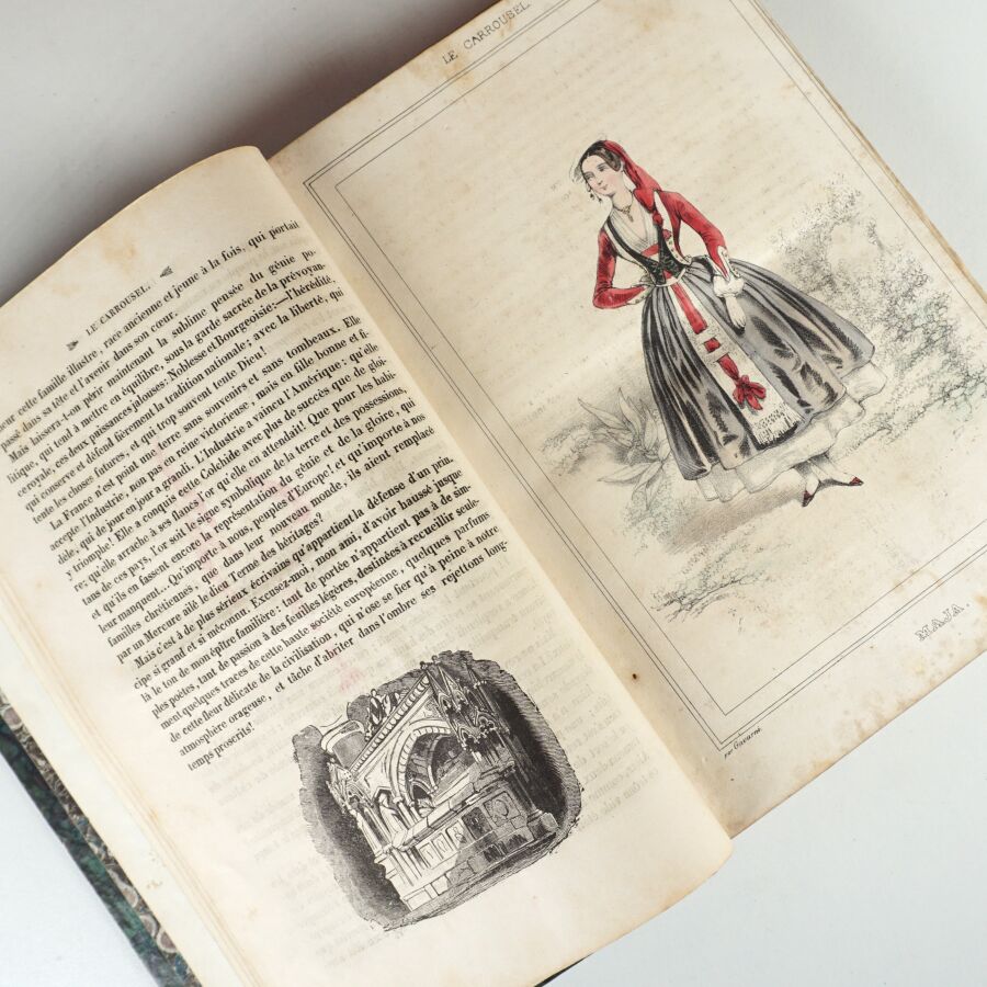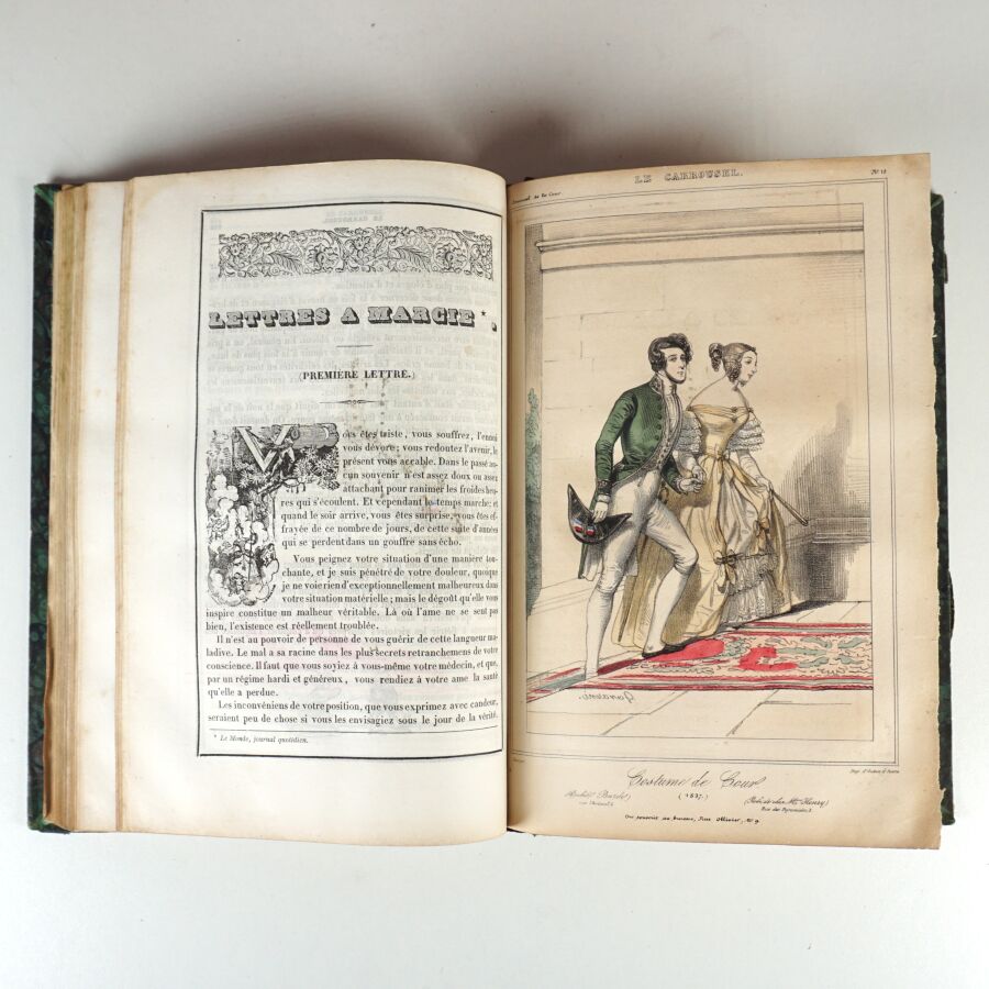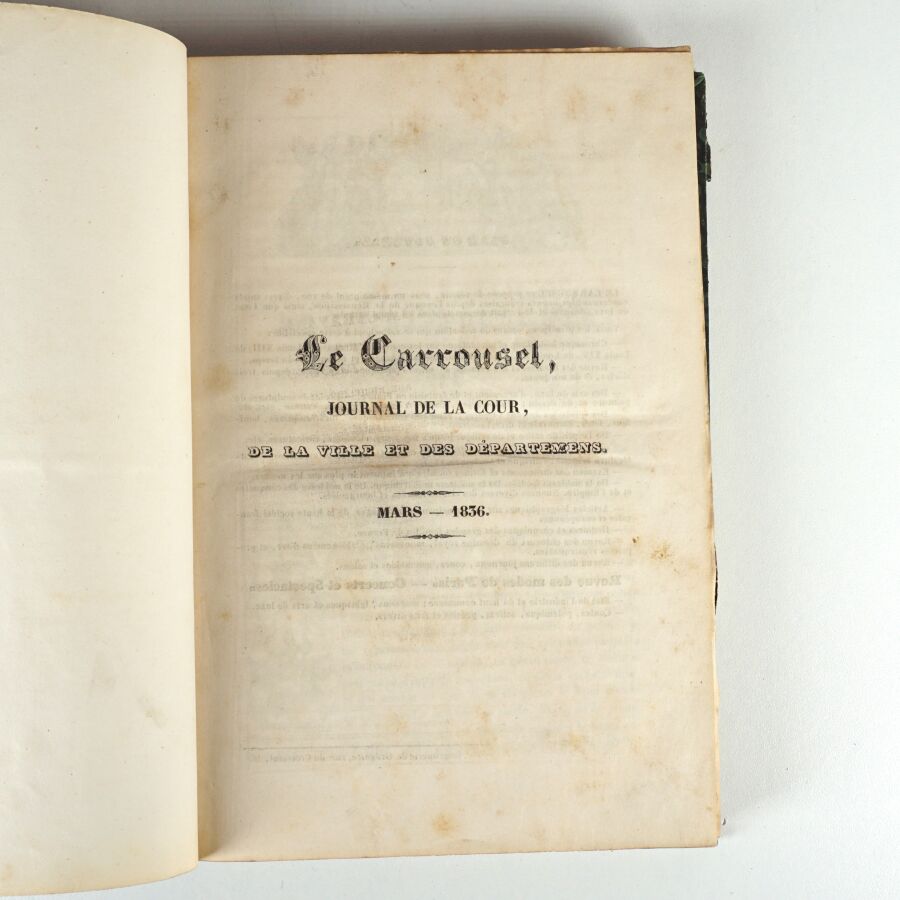 On y joint : Le Carrousel, journal de la Cour, de la ville et des départements. Mars[-juin] 1836. In-8 demi-veau vert, dos lisse orné. 25 planches gravées hors texte dont 14 planches de modes (ou caricature) aquarellées.