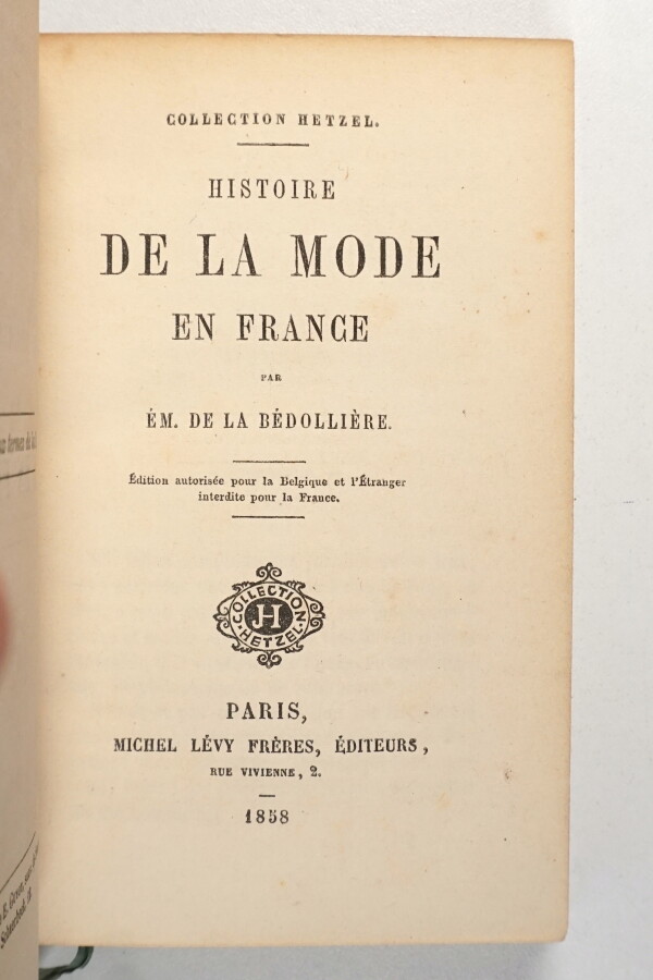 [MODE] - LA BÉDOLLIÈRE (Ém. de) - Histoire de la mode en France - Paris ; Michel Lévy frères, collection Hetzel, 1858 - 1 volume In-18° - Reliure de l'époque demi-maroquin chocolat - Dos à nerfs orné, titré et daté or - Bon exemplaire.