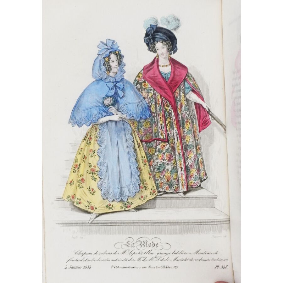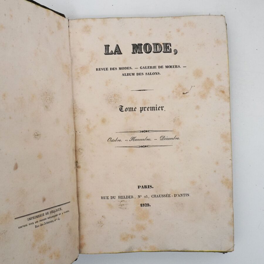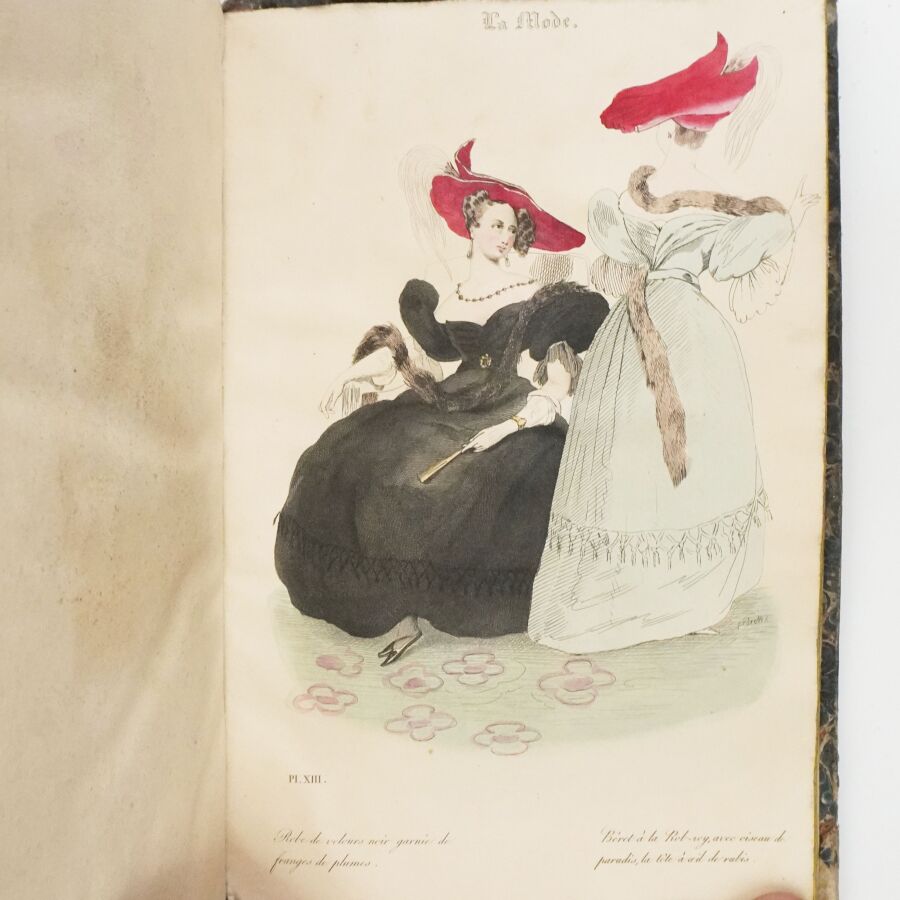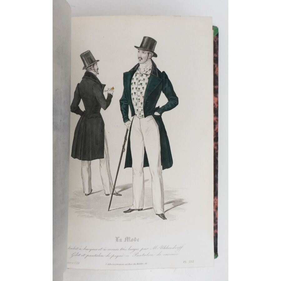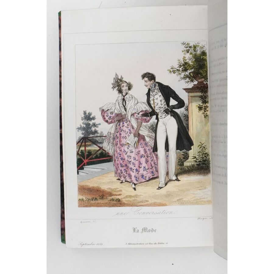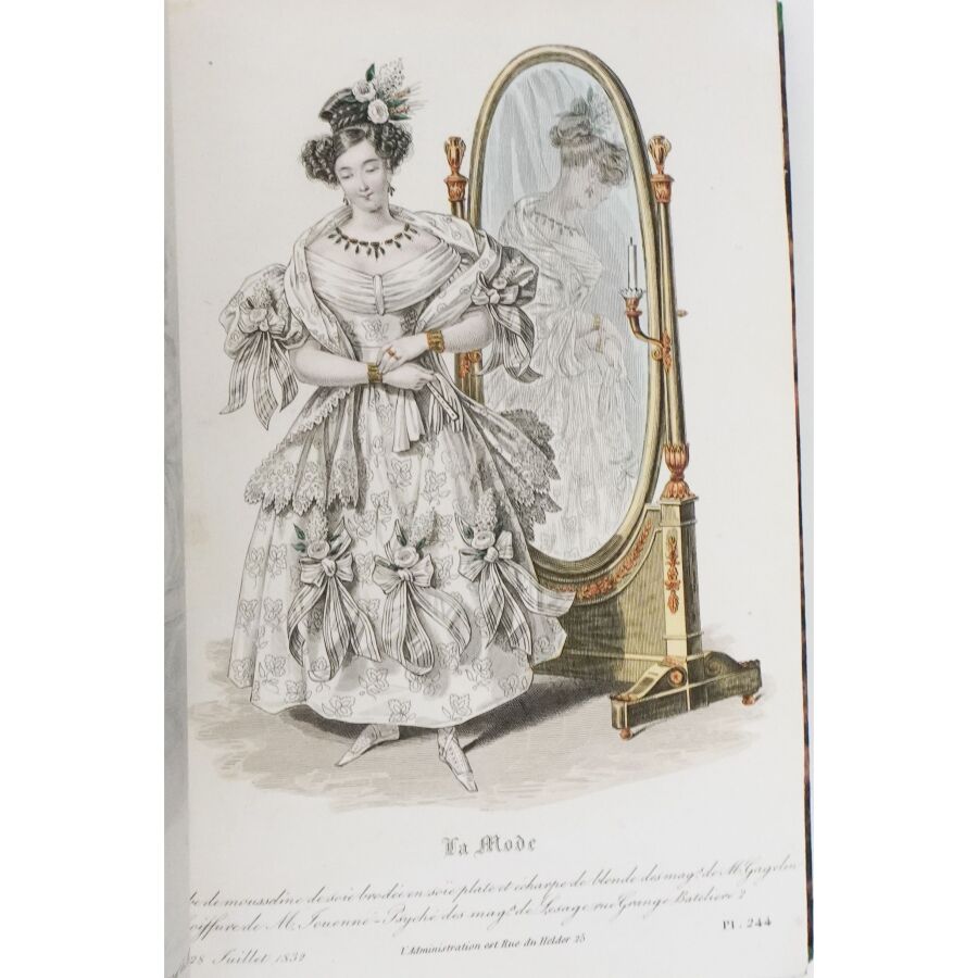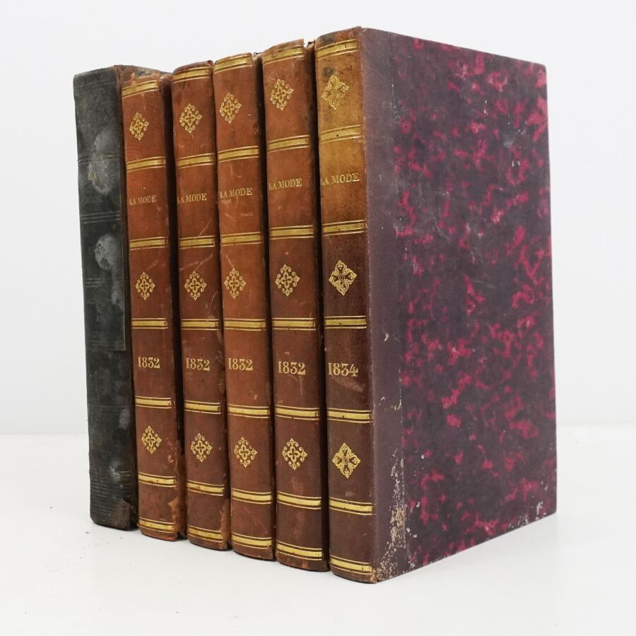 Ensemble comprenant : les 13 premières livraisons (octobre à décembre 1829), 11 pl. couleurs sur 19 in fine ; 14 livraisons d'octobre 1831 à janvier 1832, 19 pl. couleurs ; 13 livraisons de janvier à avril 1832, 20 pl. couleurs ; 13 livraisons d'avril à juillet 1832, 18 pl. couleurs ; 13 livraisons de juillet à octobre 1832, 19 pl. couleurs ; 13 livraisons de janvier à avril 1834, 18 pl. couleurs et 1 vue en noir. Soit un ensemble illustré de 105 pl. couleurs de costumes féminins et masculins. Reliure abîmée et fortes mouillures au premier tome, qqs défauts d'usage et intérieur frais pour les suivants. La Mode est une revue hebdomadaire française fondée en 1829 par Émile de Girardin. Conçue essentiellement pour être un journal de mode et de littérature, la revue prit, dès 1831, une tournure politique très marquée avec Alfred Du Fougerais qui y attaqua violemment Louis-Philippe.