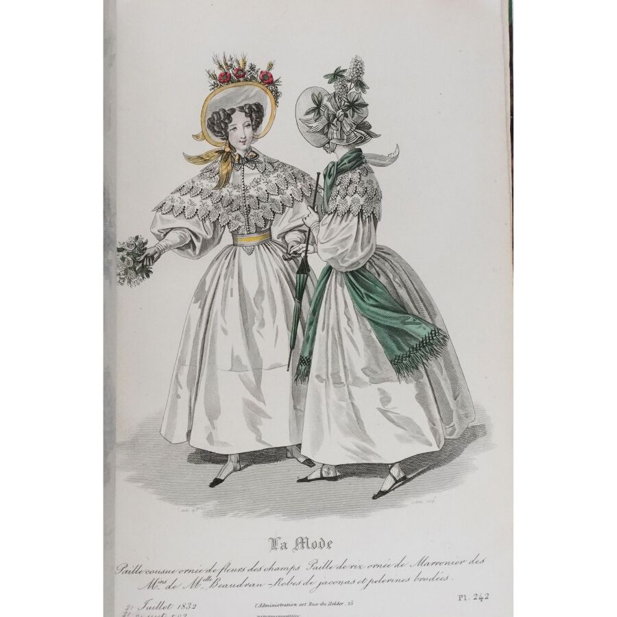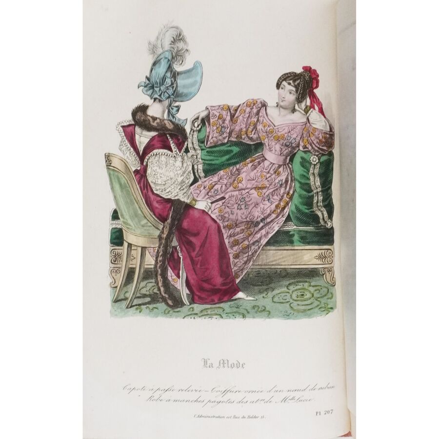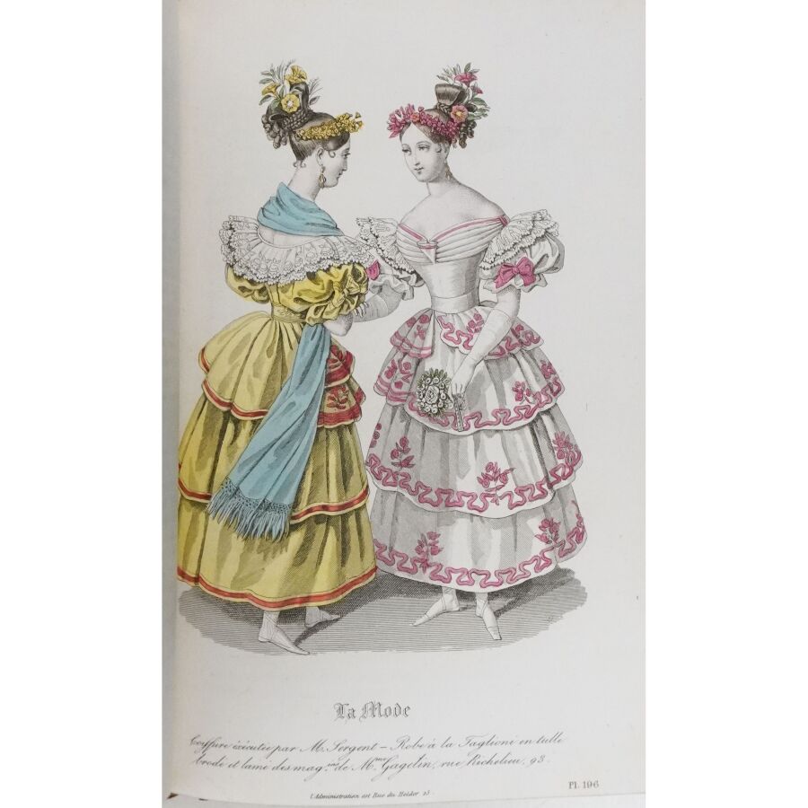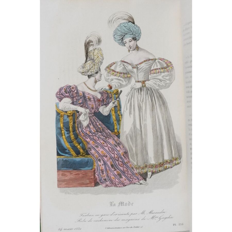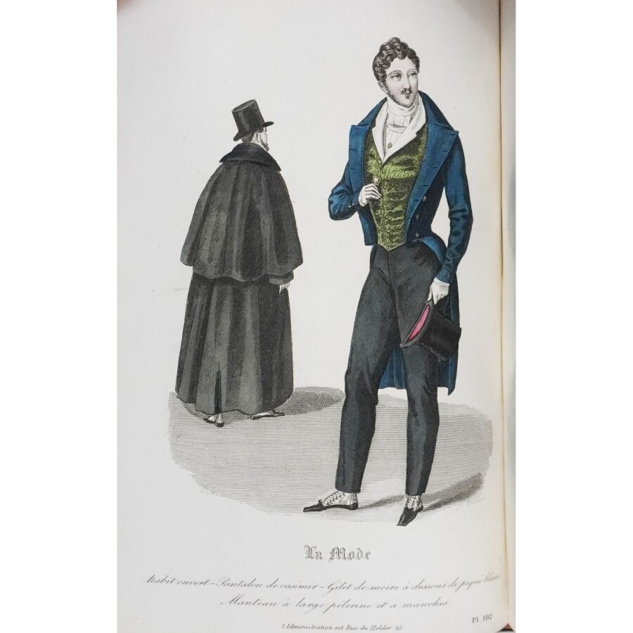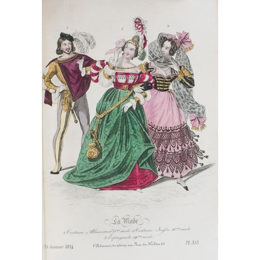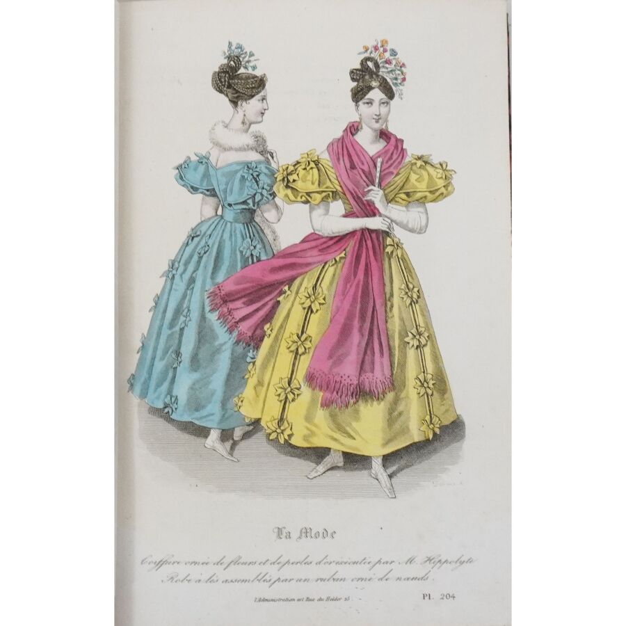 Ensemble comprenant : les 13 premières livraisons (octobre à décembre 1829), 11 pl. couleurs sur 19 in fine ; 14 livraisons d'octobre 1831 à janvier 1832, 19 pl. couleurs ; 13 livraisons de janvier à avril 1832, 20 pl. couleurs ; 13 livraisons d'avril à juillet 1832, 18 pl. couleurs ; 13 livraisons de juillet à octobre 1832, 19 pl. couleurs ; 13 livraisons de janvier à avril 1834, 18 pl. couleurs et 1 vue en noir. Soit un ensemble illustré de 105 pl. couleurs de costumes féminins et masculins. Reliure abîmée et fortes mouillures au premier tome, qqs défauts d'usage et intérieur frais pour les suivants. La Mode est une revue hebdomadaire française fondée en 1829 par Émile de Girardin. Conçue essentiellement pour être un journal de mode et de littérature, la revue prit, dès 1831, une tournure politique très marquée avec Alfred Du Fougerais qui y attaqua violemment Louis-Philippe.