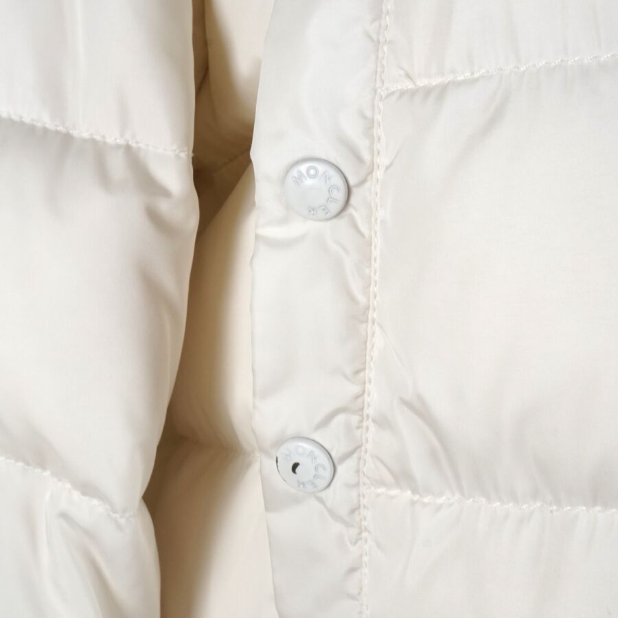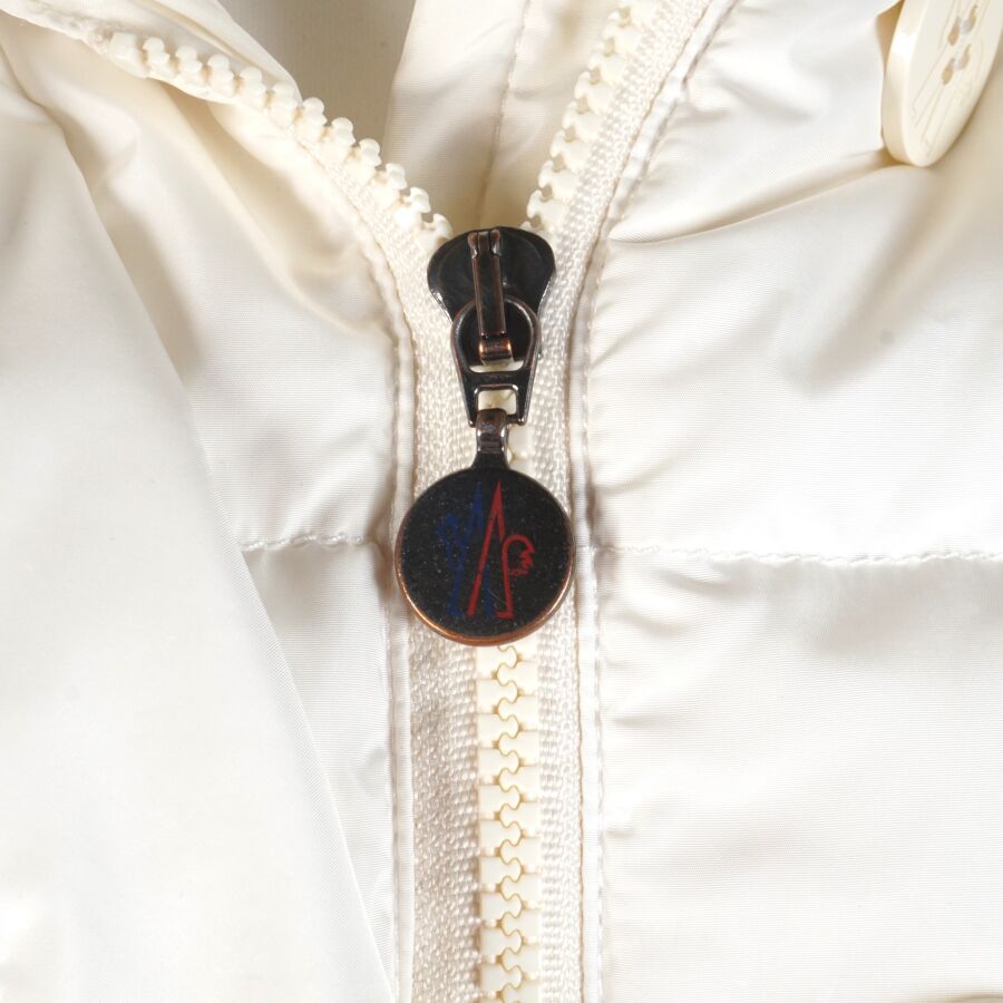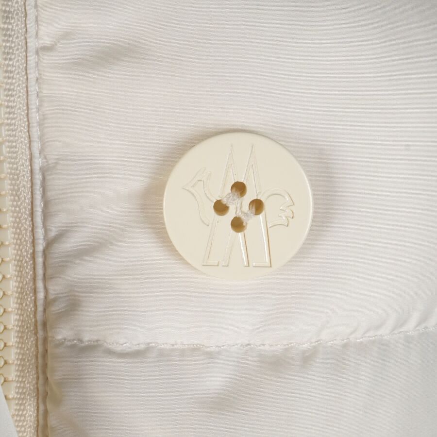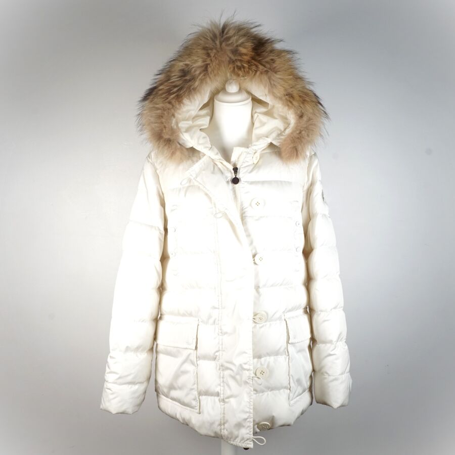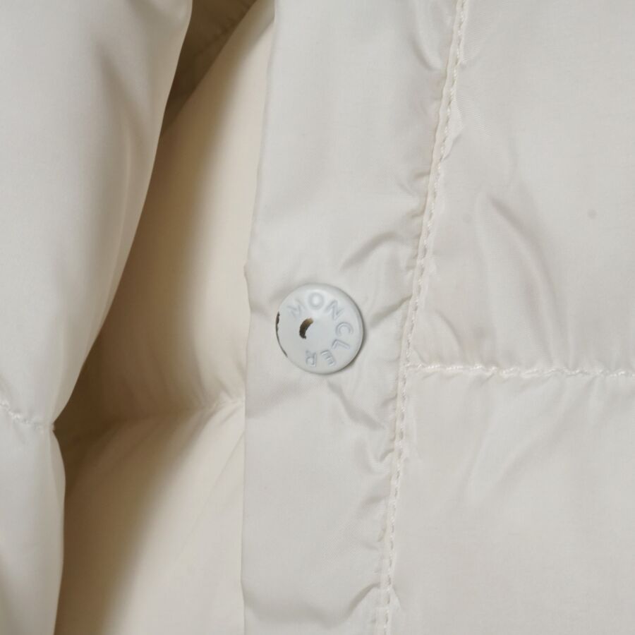 MONCLER : Doudoune matelassée pour femme, couleur blanc cassé, et fourrure détachable par boutons pression, fermeture zippée à double sens et fermeture au-dessus par 4 boutons logotés, deux poches en parties hautes à boutons pression, deux poches en partie basse à rabat, taille supposée M, L. Totale : 74 cm environ (bel état général, légères usures).
