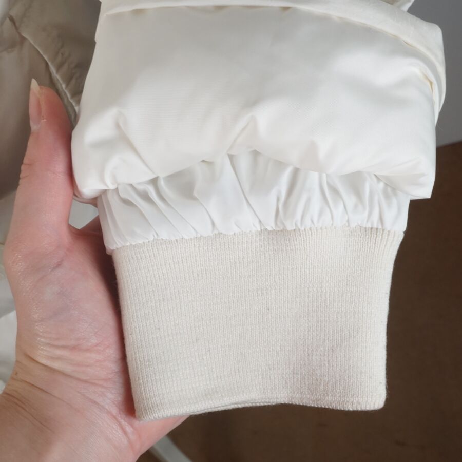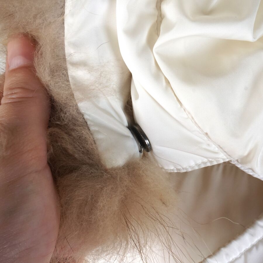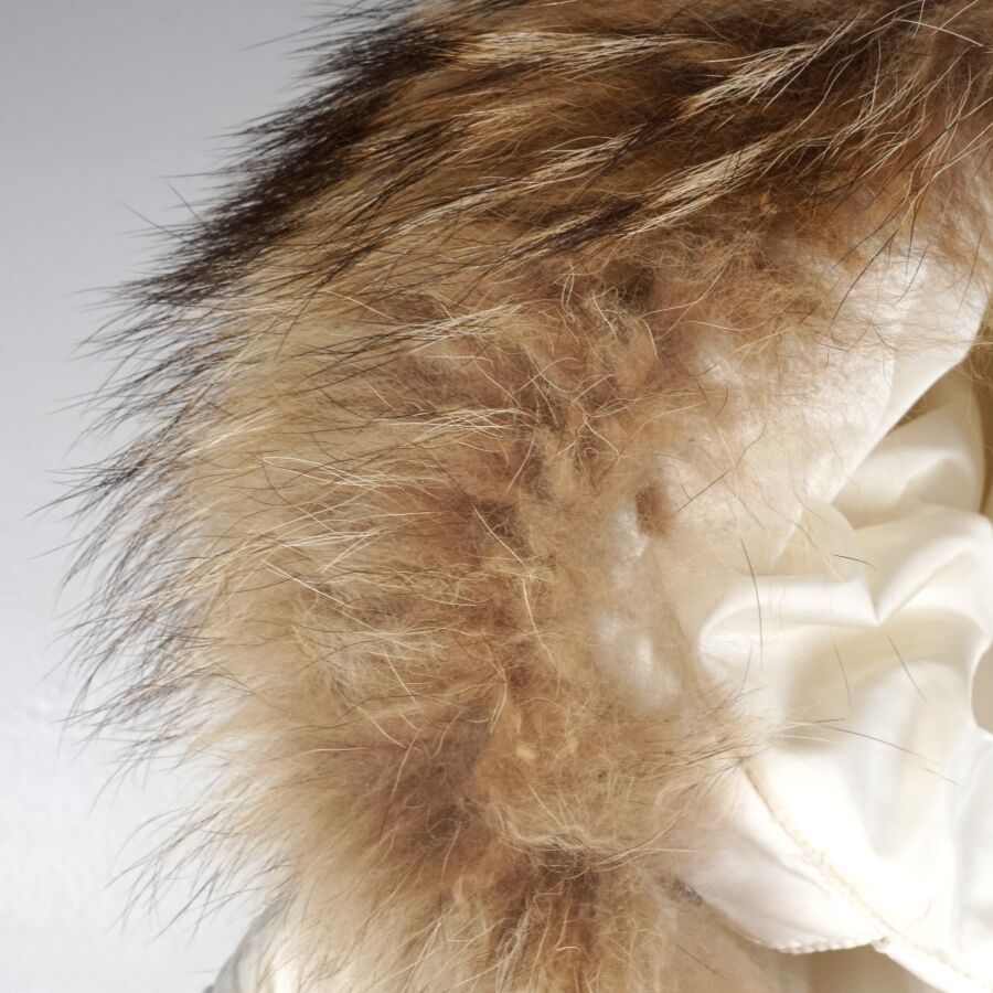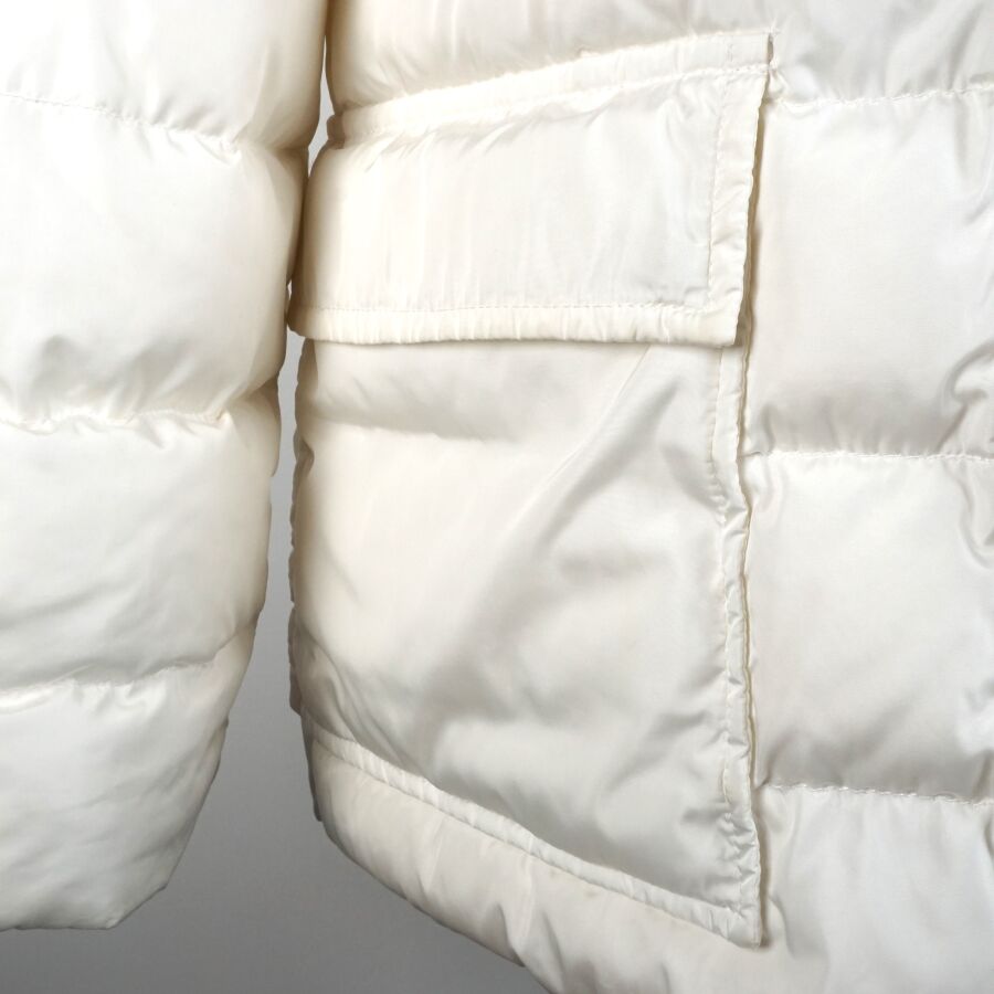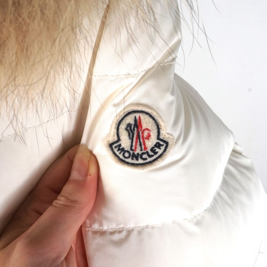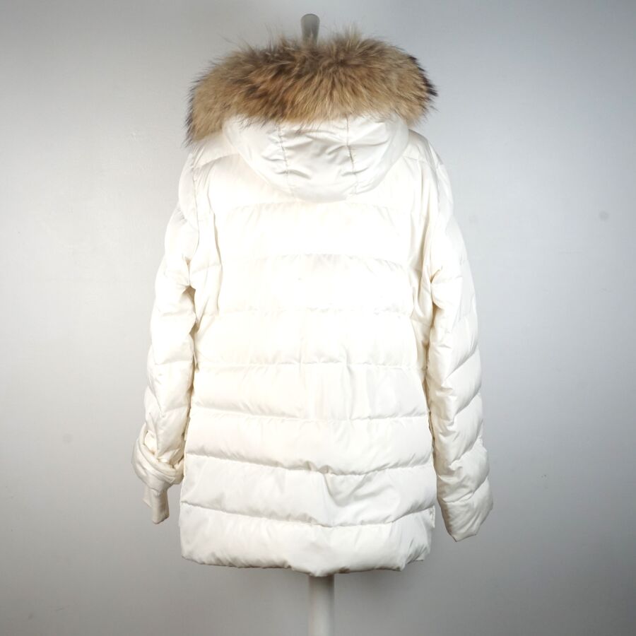 MONCLER : Doudoune matelassée pour femme, couleur blanc cassé, et fourrure détachable par boutons pression, fermeture zippée à double sens et fermeture au-dessus par 4 boutons logotés, deux poches en parties hautes à boutons pression, deux poches en partie basse à rabat, taille supposée M, L. Totale : 74 cm environ (bel état général, légères usures).