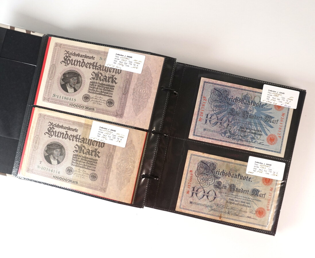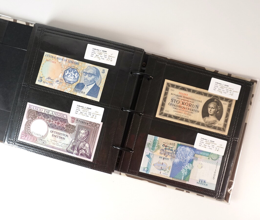 MONDE : Classeur de 150 billets environ, comprenant : Espagne (+), Allemagne (+), Hollande, Roumanie, Ecosse, Hongrie, Angleterre, Italie, Egypte, Portugal, Philippines, Laos, Nicaragua, Argentine et divers.