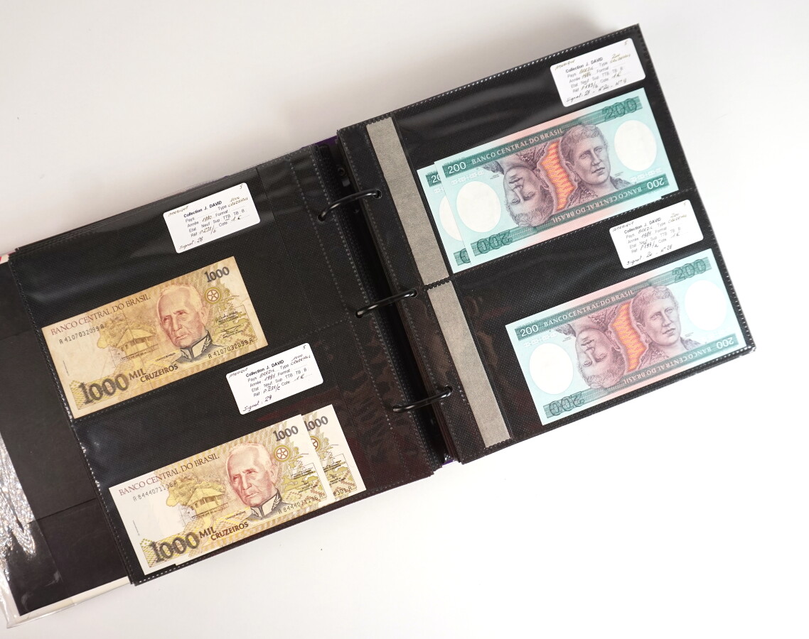 MONDE : Classeur de 180 billets, principalement d'Amérique du sud dont : Argentine, Bolivie, Brésil, Colombie, Chili, Costa-Rica, Guatemala, Equateur, Uruguay, Suriname, Pérou, Paraguay, Nicaragua, Honduras, Venezuela et divers.